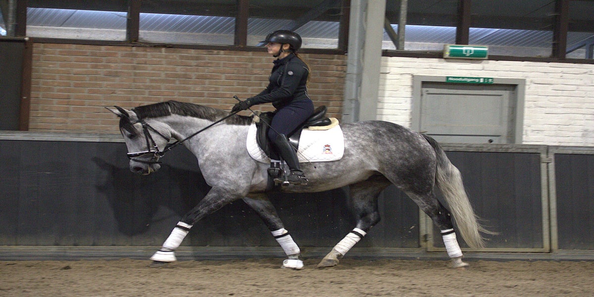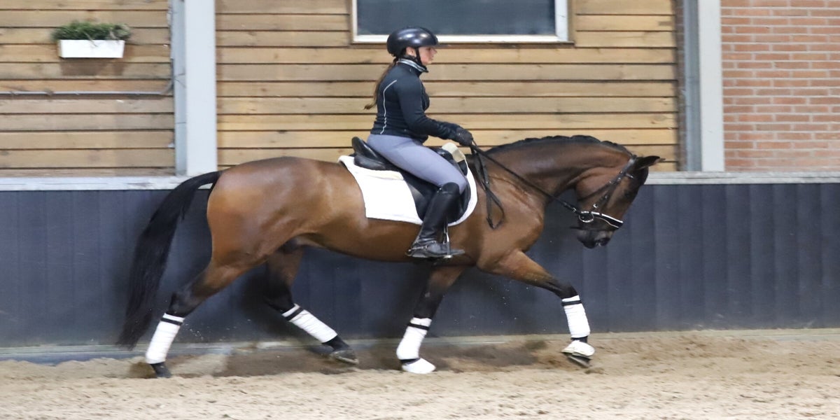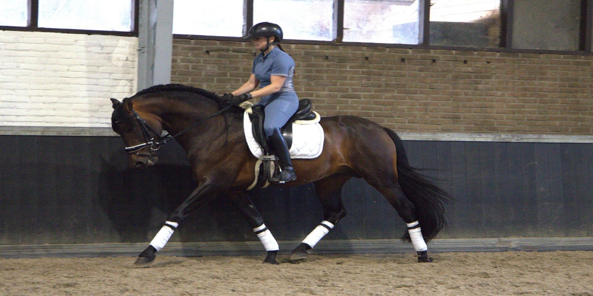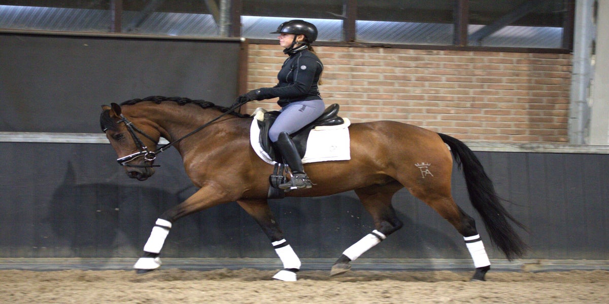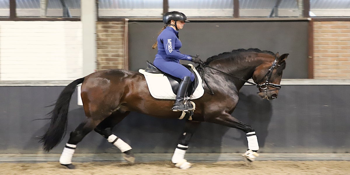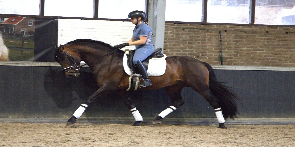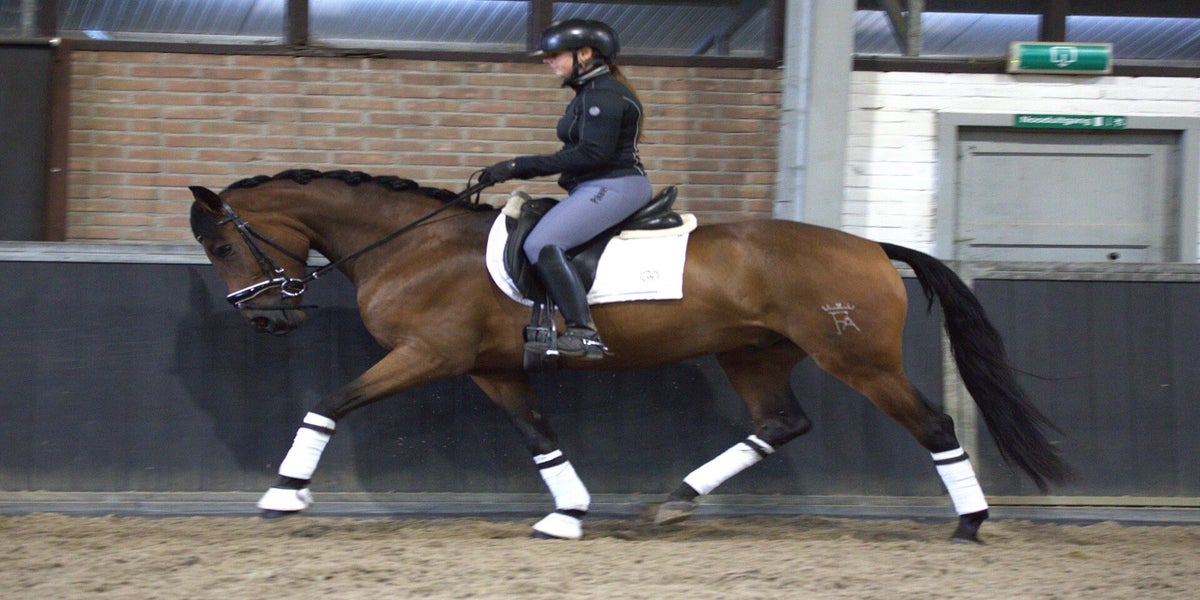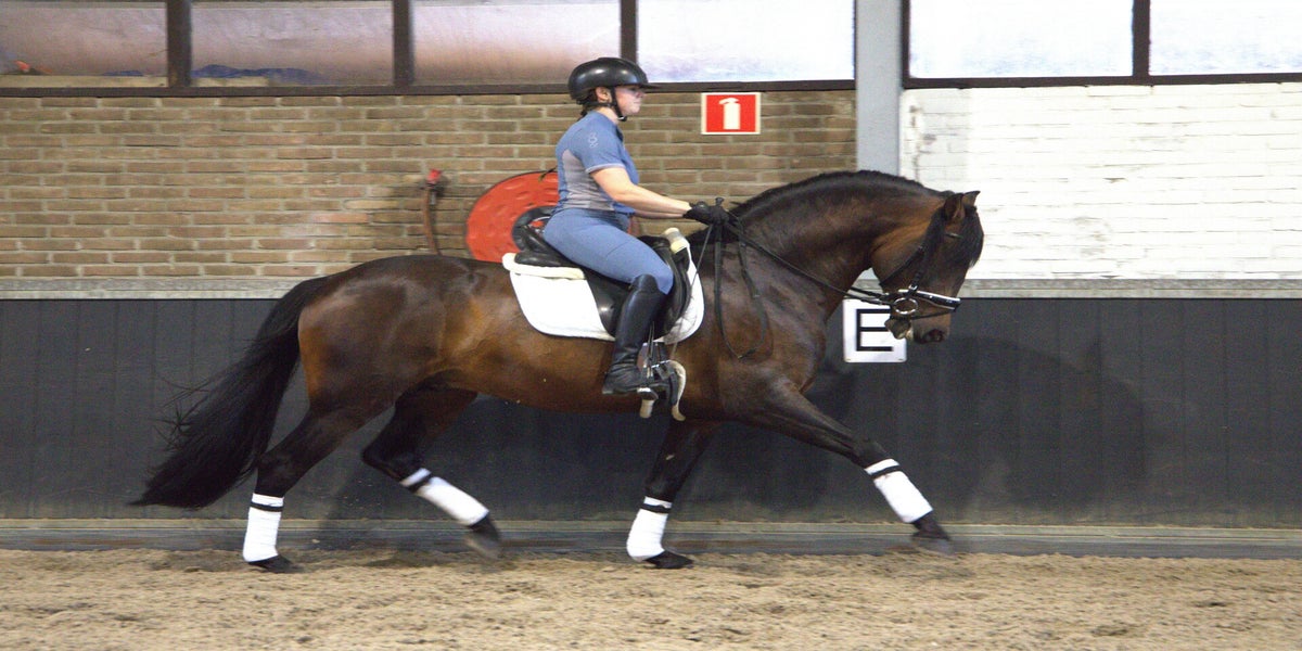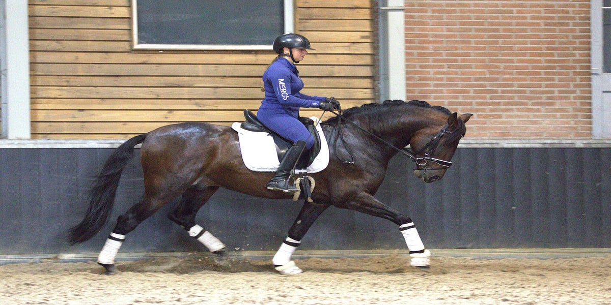 Onder het zadel laat hij al veel talent zien: een ruime, krachtige stap met veel losheid door het hele lijf. De basis beheerst hij en hij wordt rustig verder doorgetraind om aan conditie en bespiering te werken.