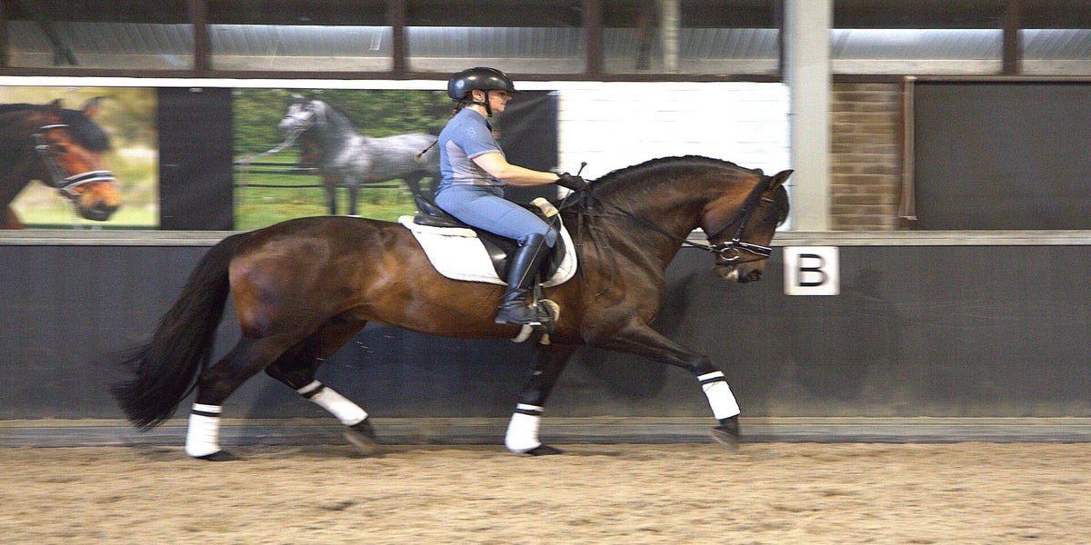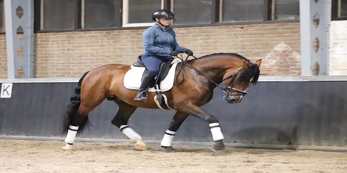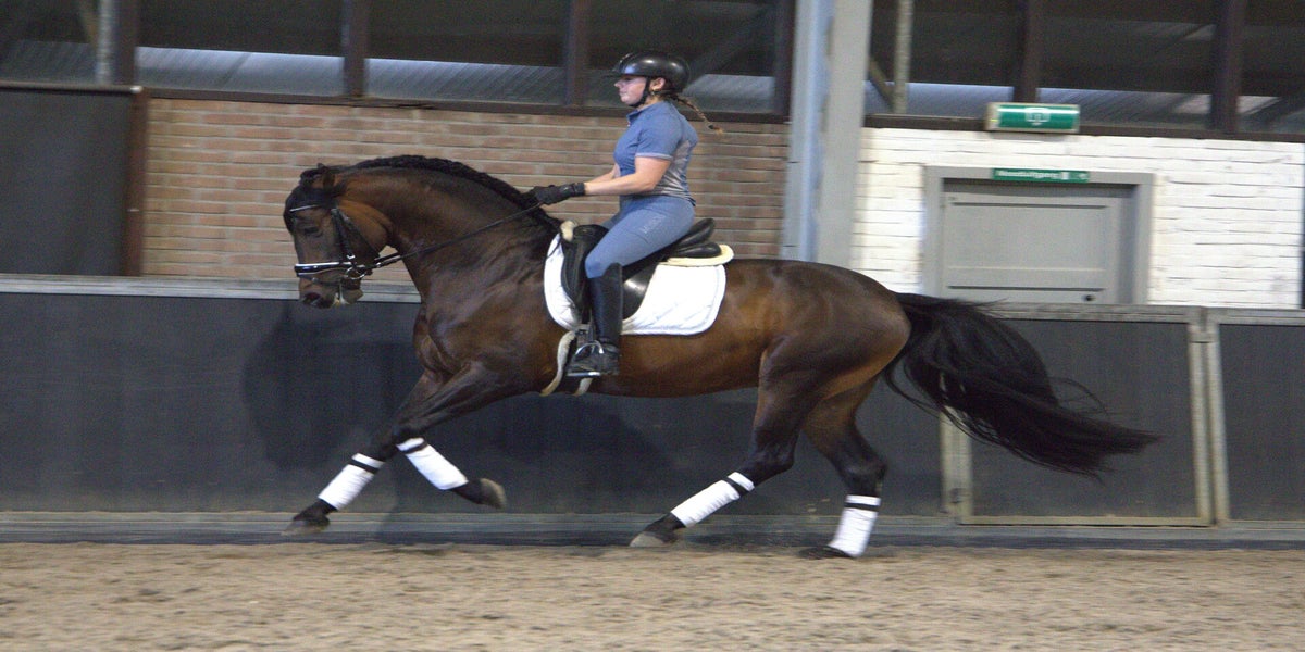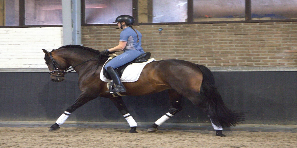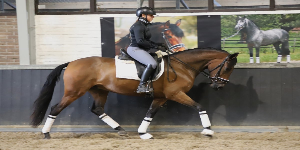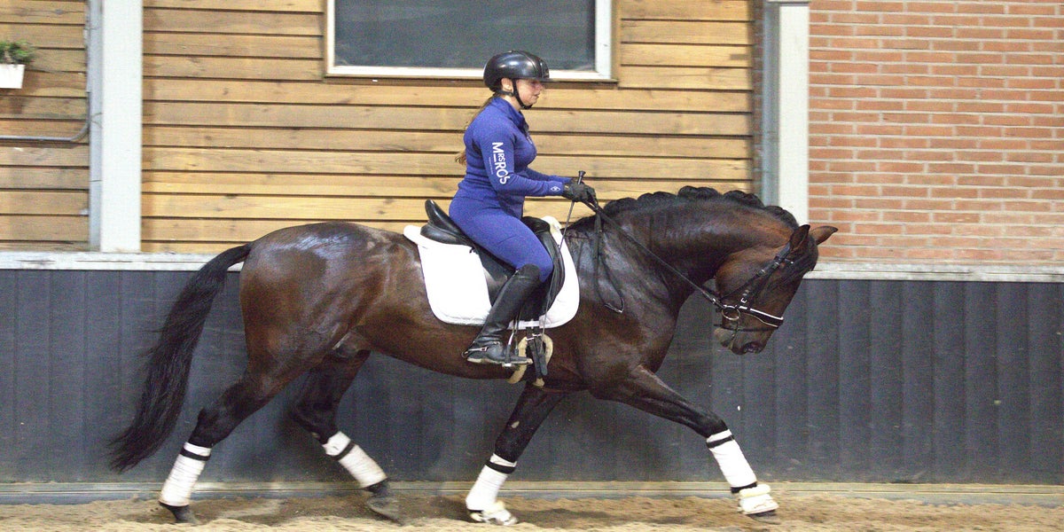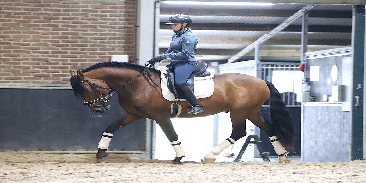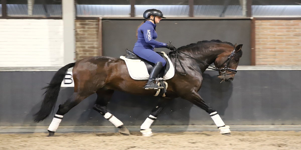 Onder het zadel laat hij al veel talent zien: een ruime, krachtige stap met veel losheid door het hele lijf. De basis beheerst hij en hij wordt rustig verder doorgetraind om aan conditie en bespiering te werken.