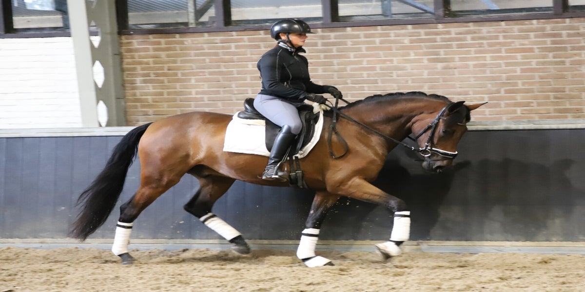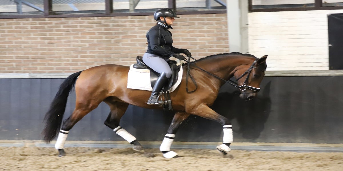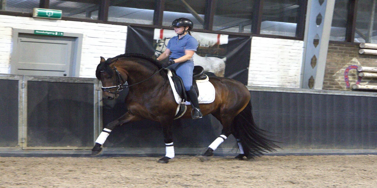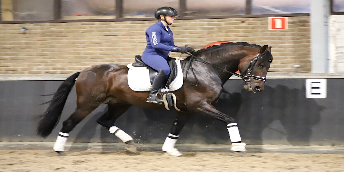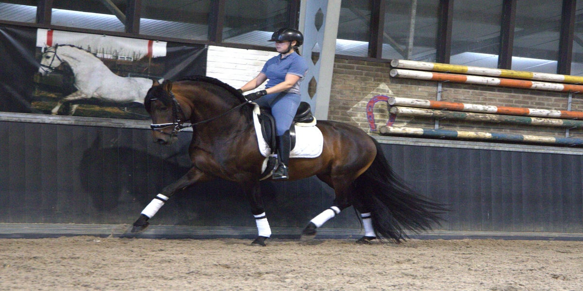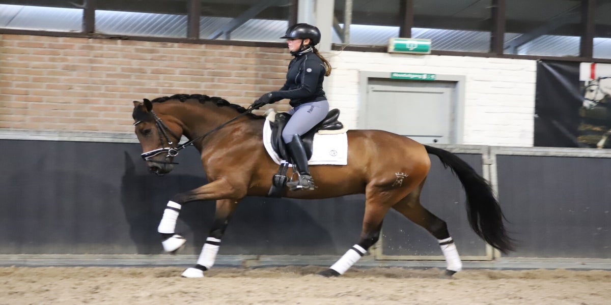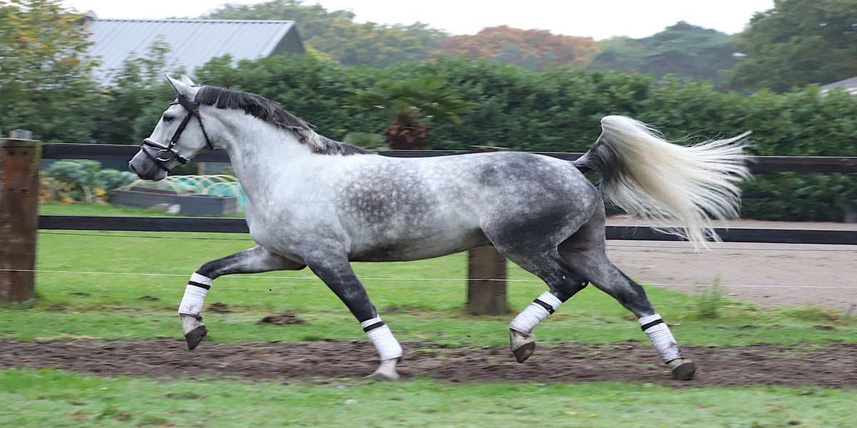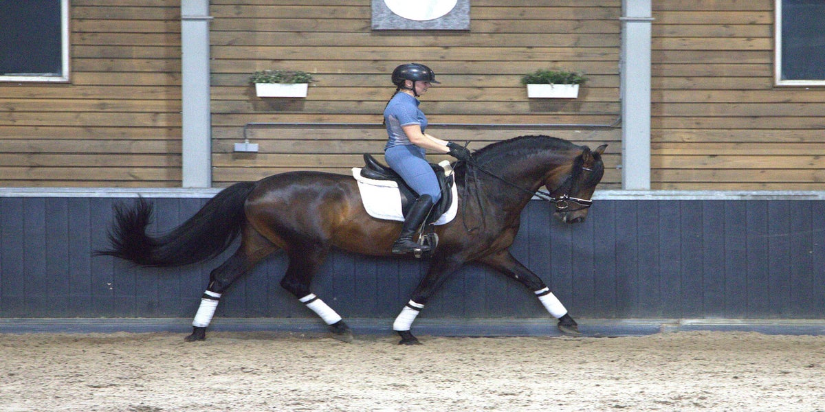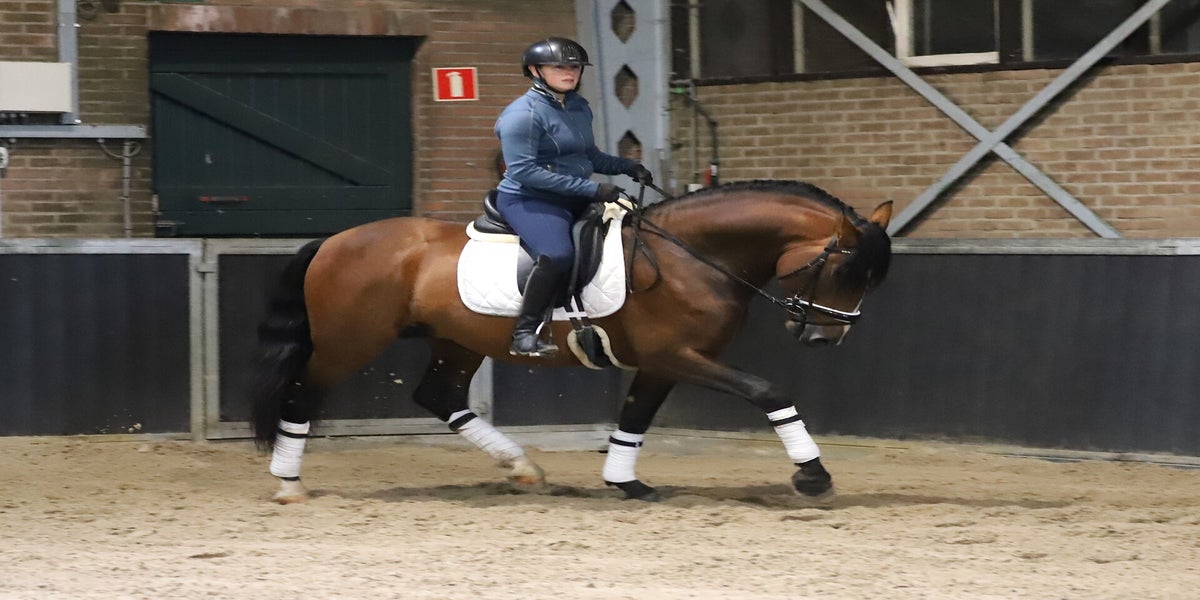 Onder het zadel laat hij al veel talent zien: een ruime, krachtige stap met veel losheid door het hele lijf. De basis beheerst hij en hij wordt rustig verder doorgetraind om aan conditie en bespiering te werken.
