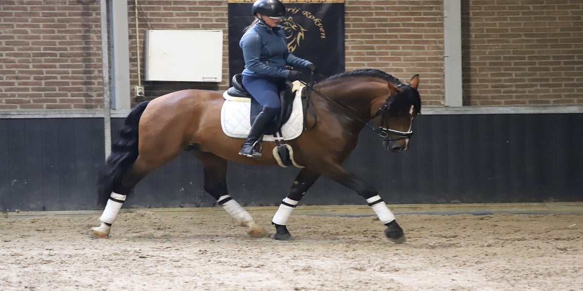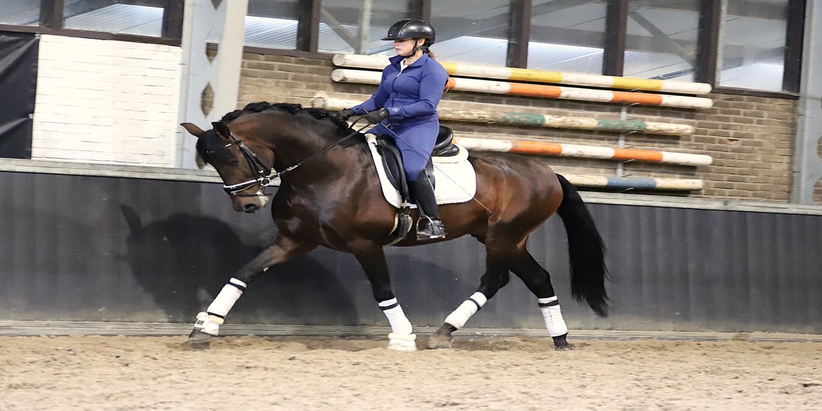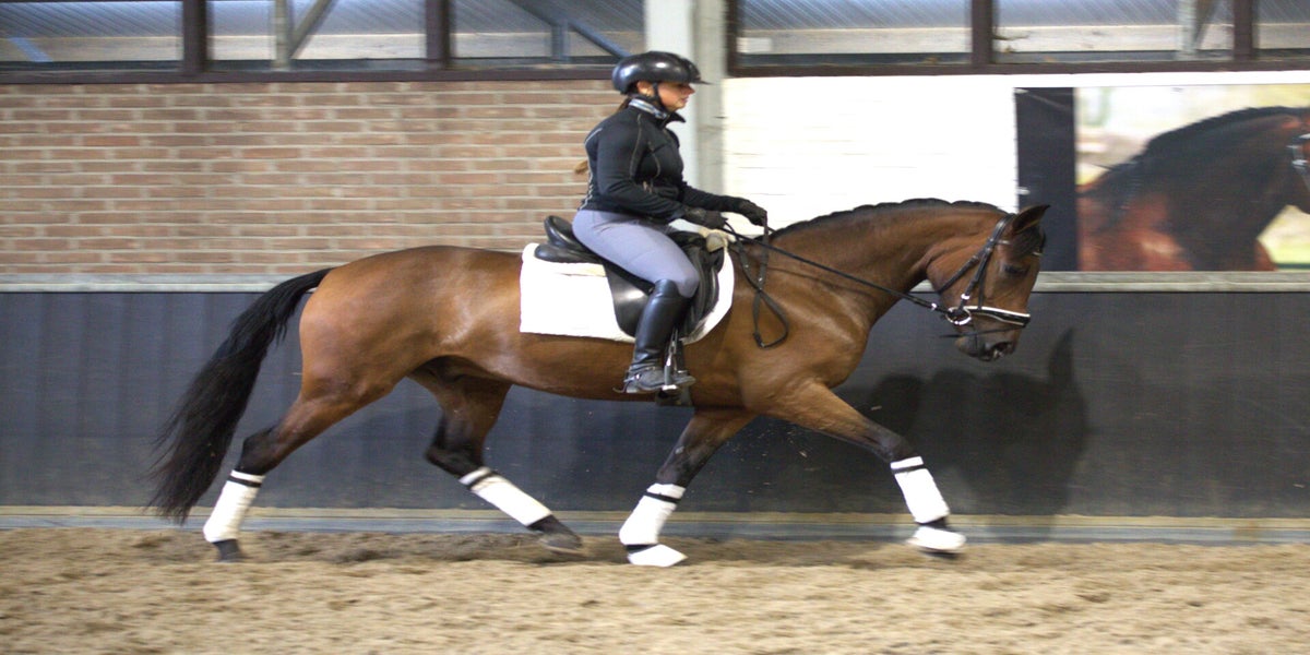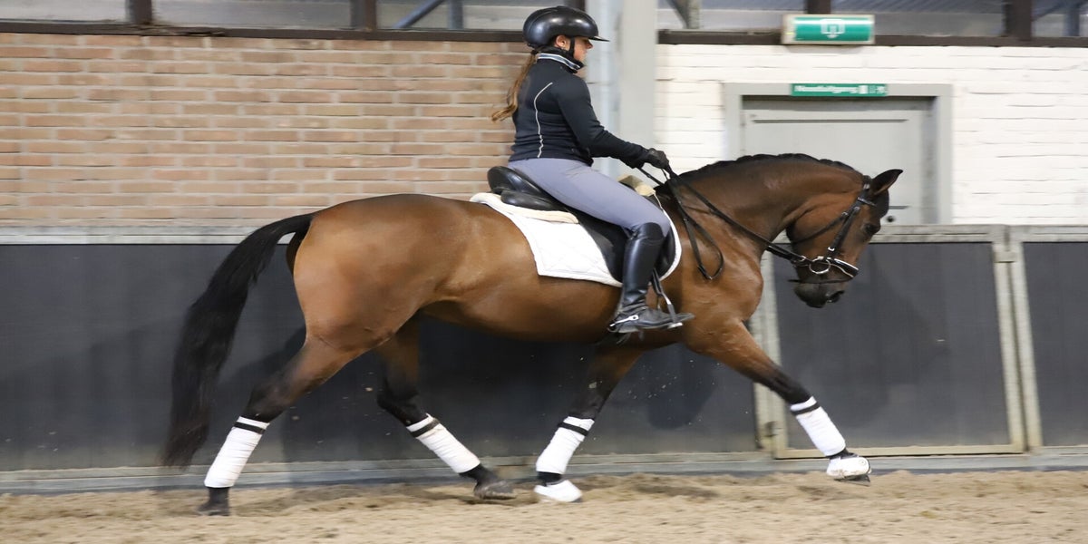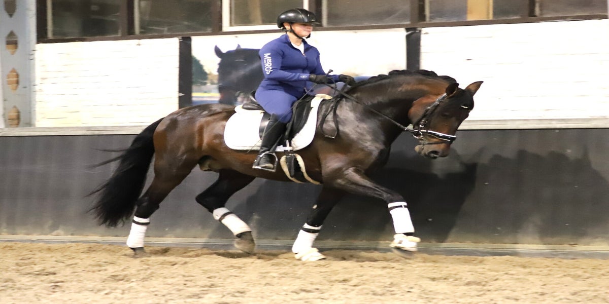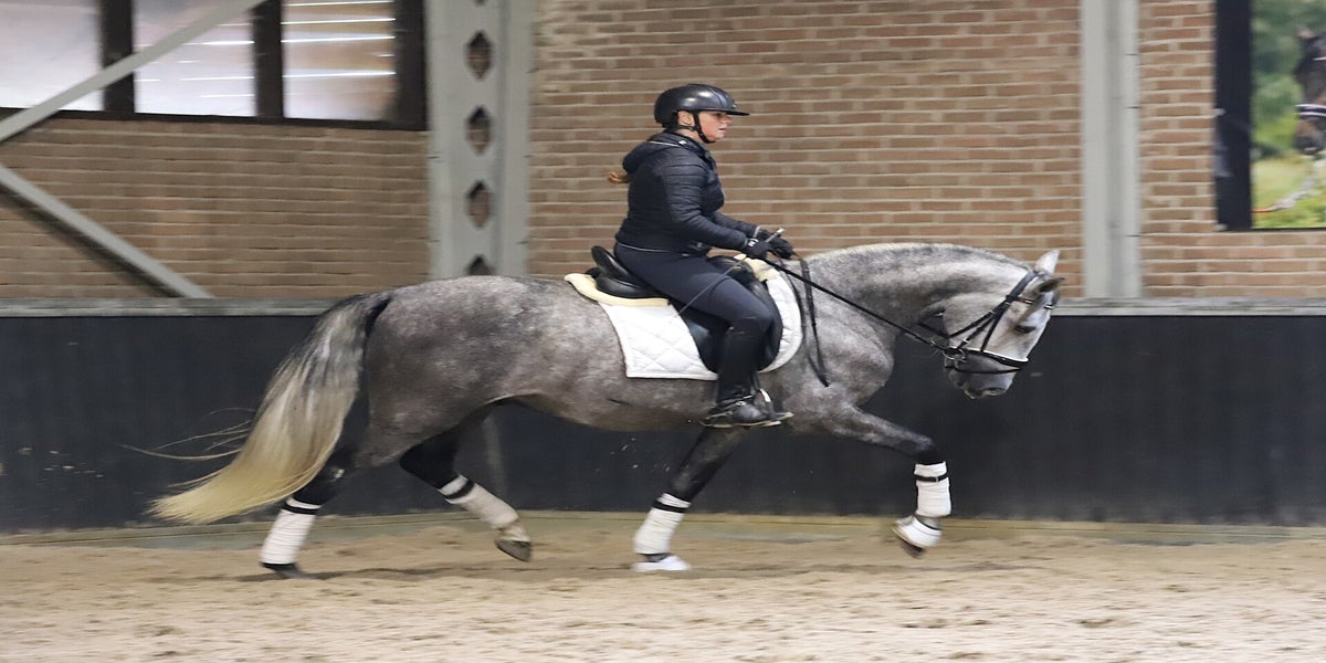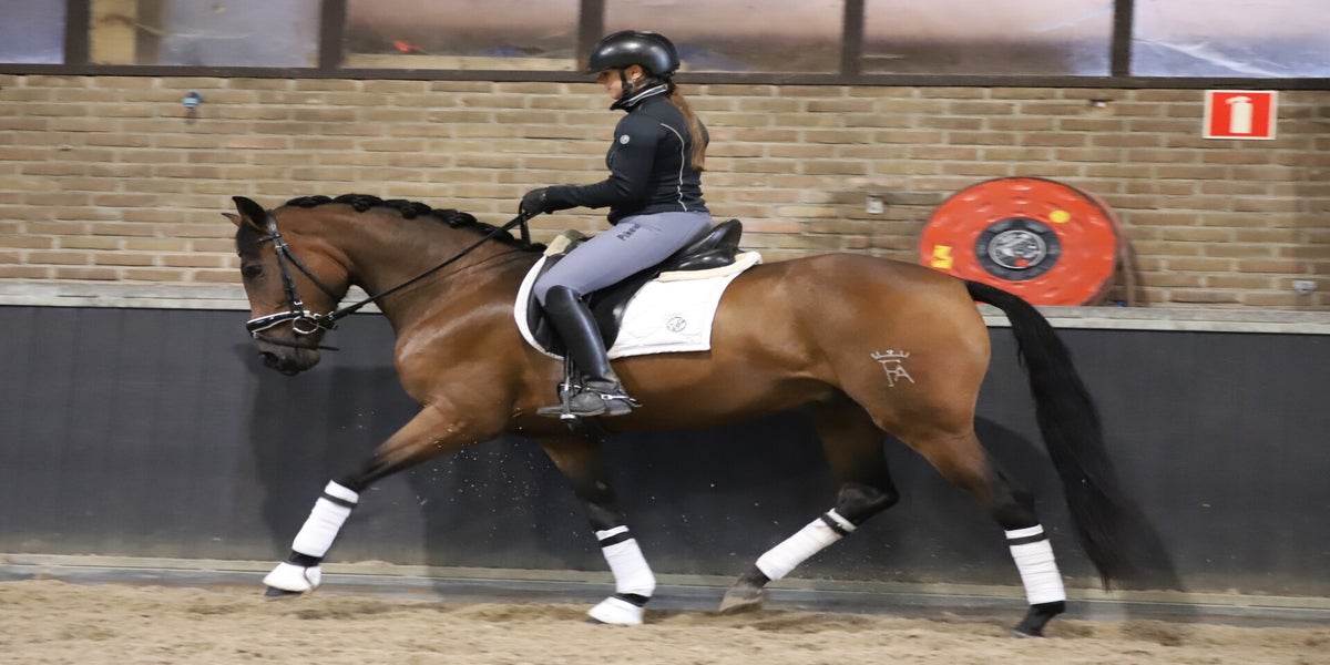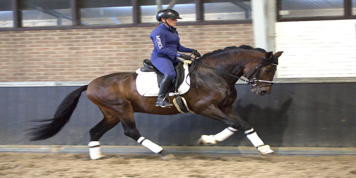Onder het zadel laat hij al veel talent zien: een ruime, krachtige stap met veel losheid door het hele lijf. De basis beheerst hij en hij wordt rustig verder doorgetraind om aan conditie en bespiering te werken.