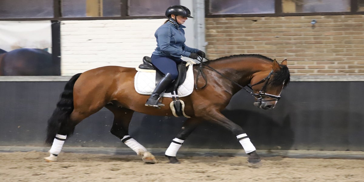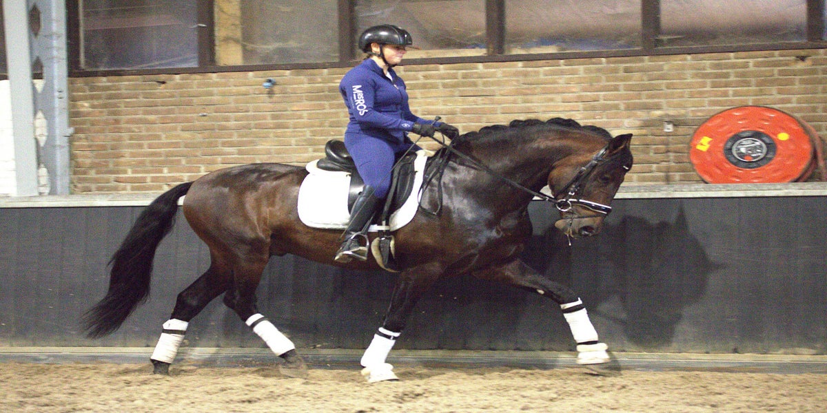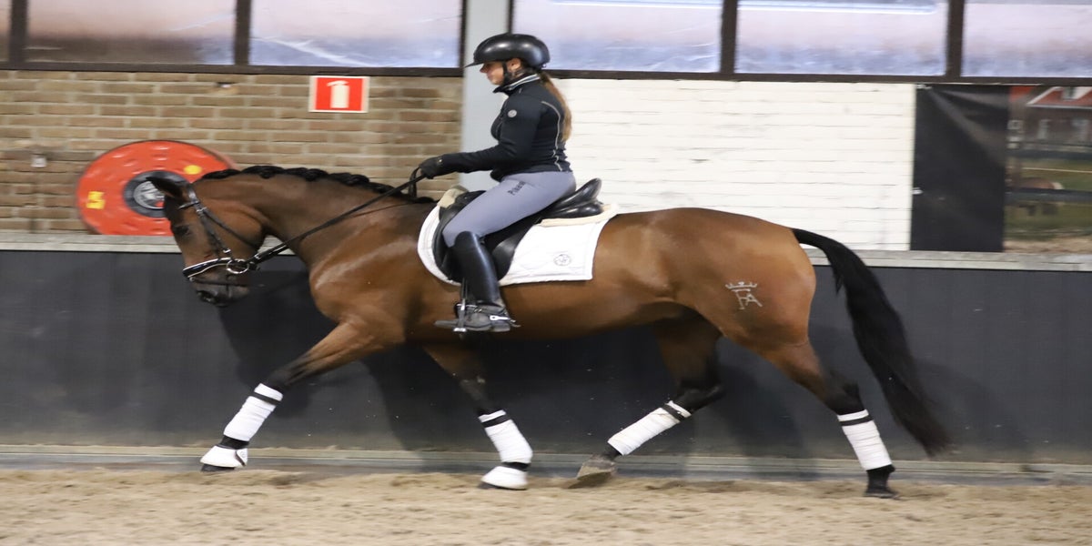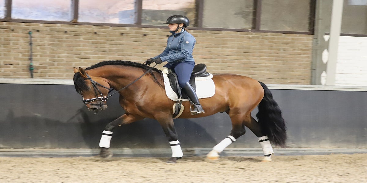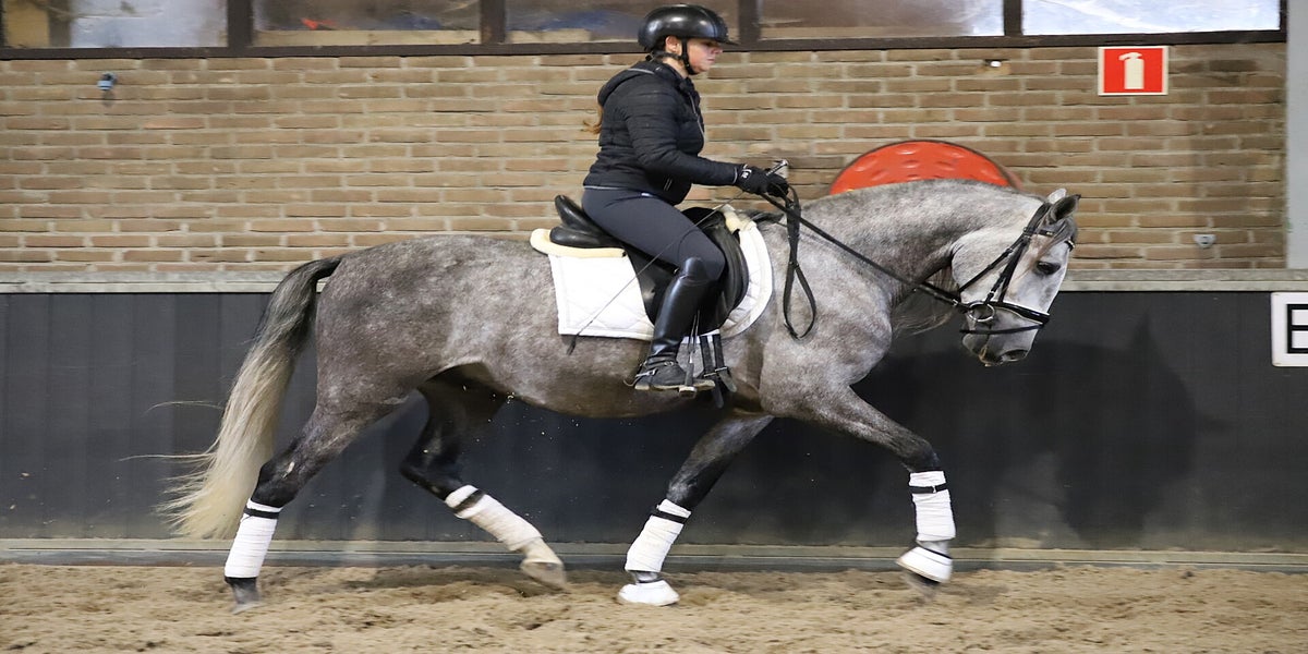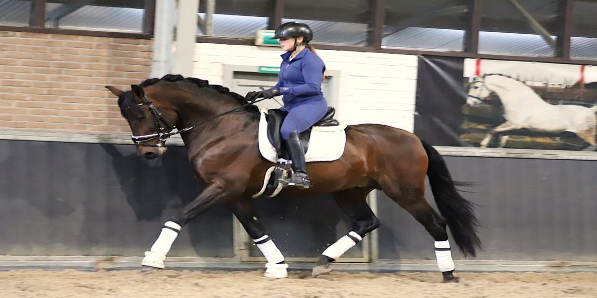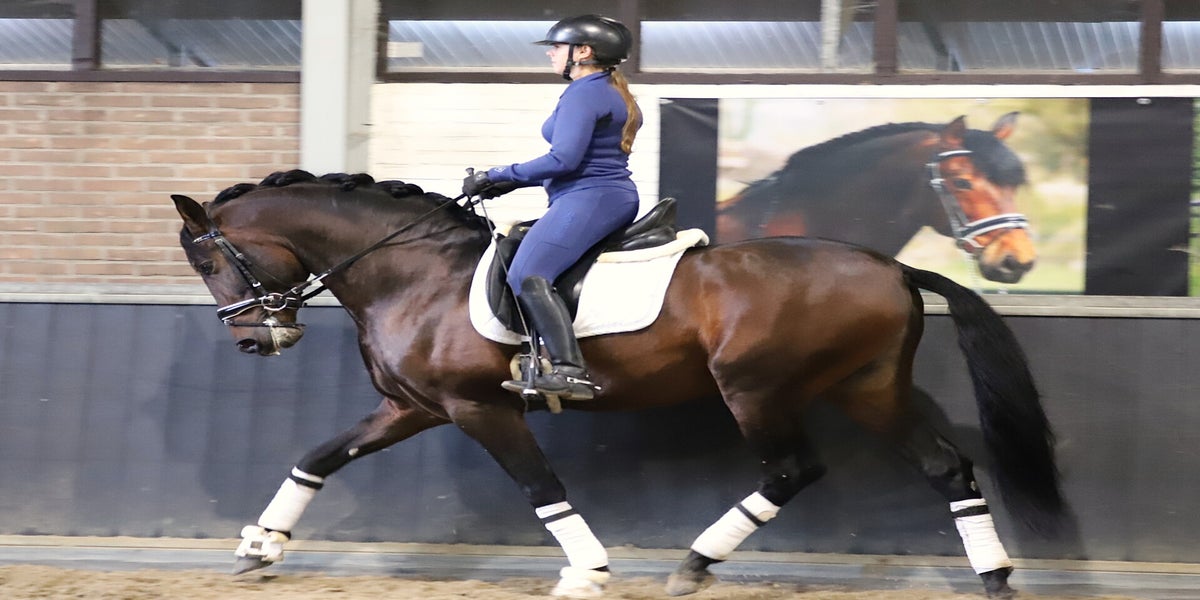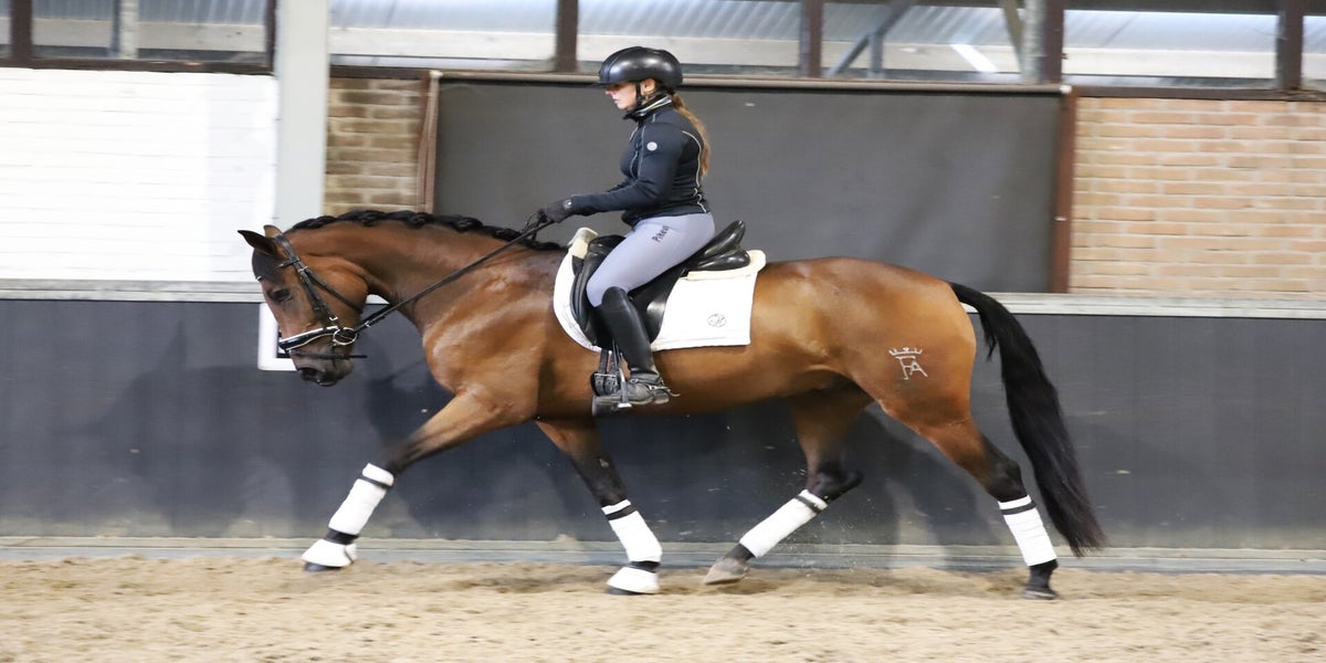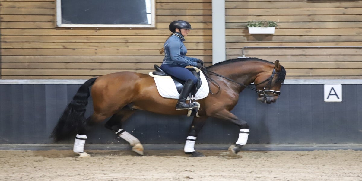 Onder het zadel laat hij al veel talent zien: een ruime, krachtige stap met veel losheid door het hele lijf. De basis beheerst hij en hij wordt rustig verder doorgetraind om aan conditie en bespiering te werken.