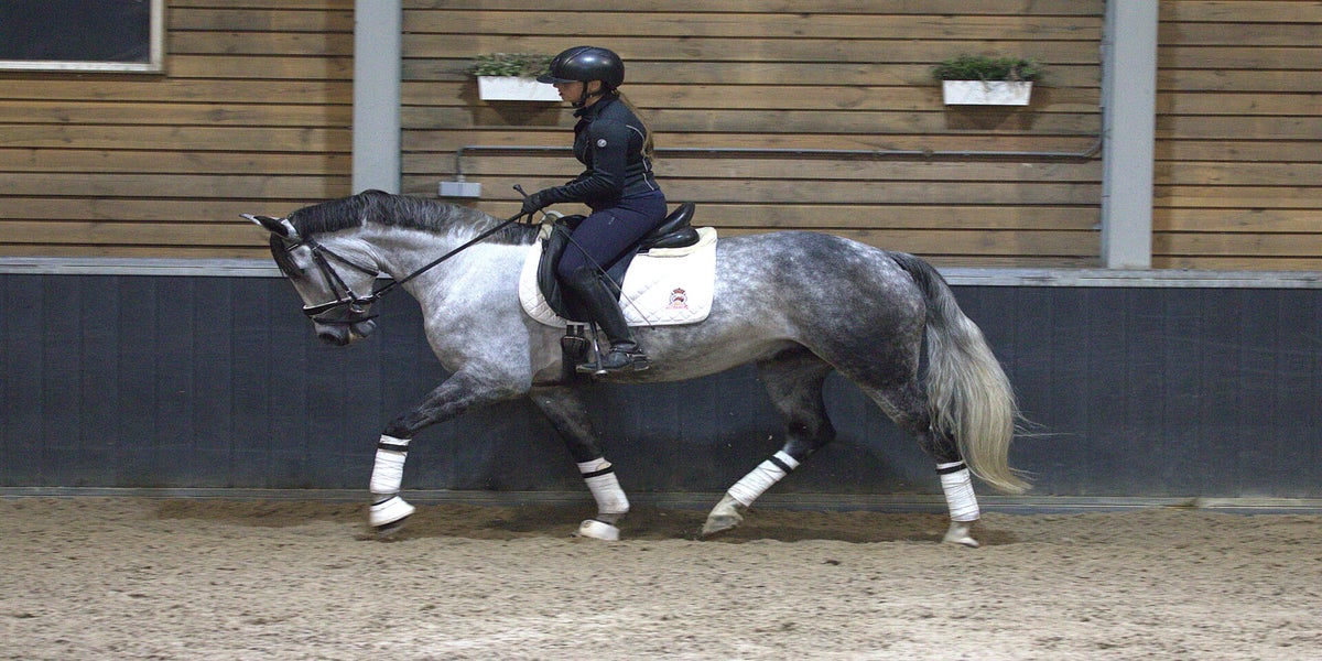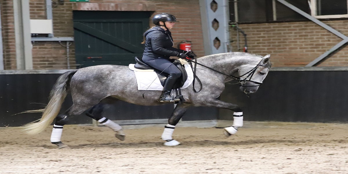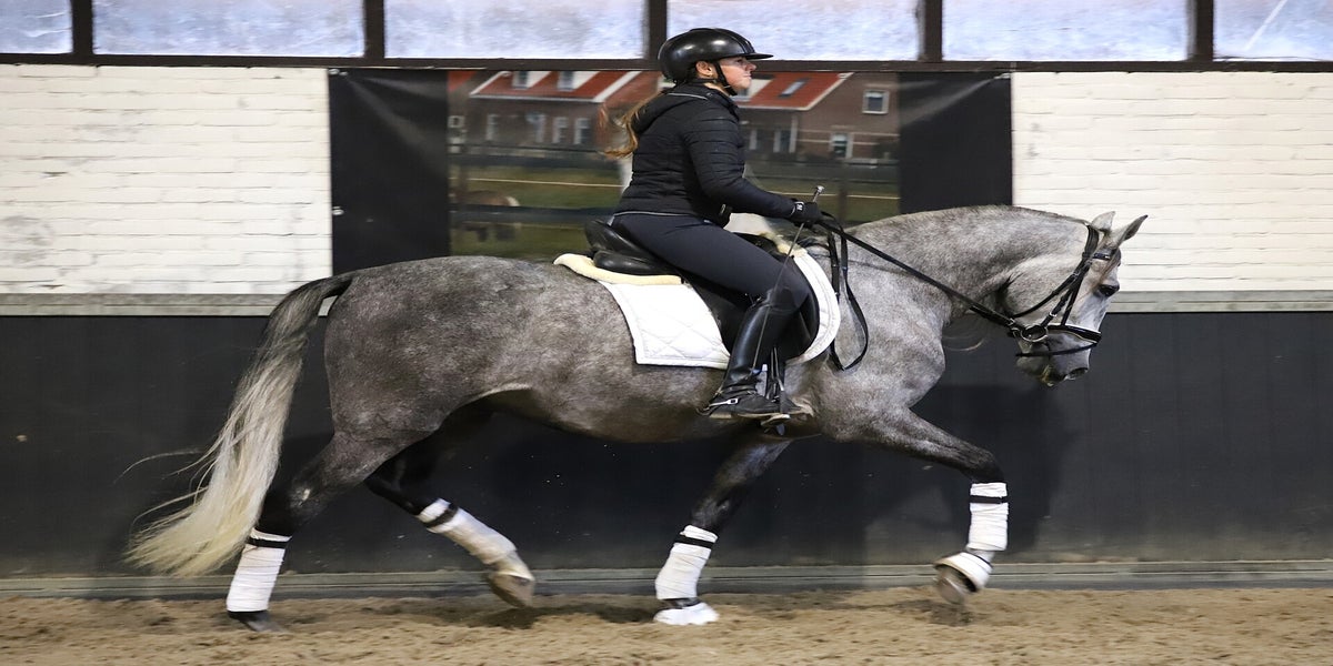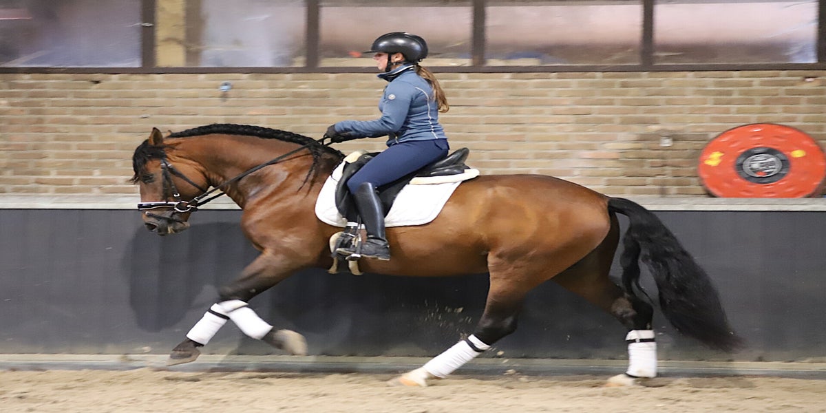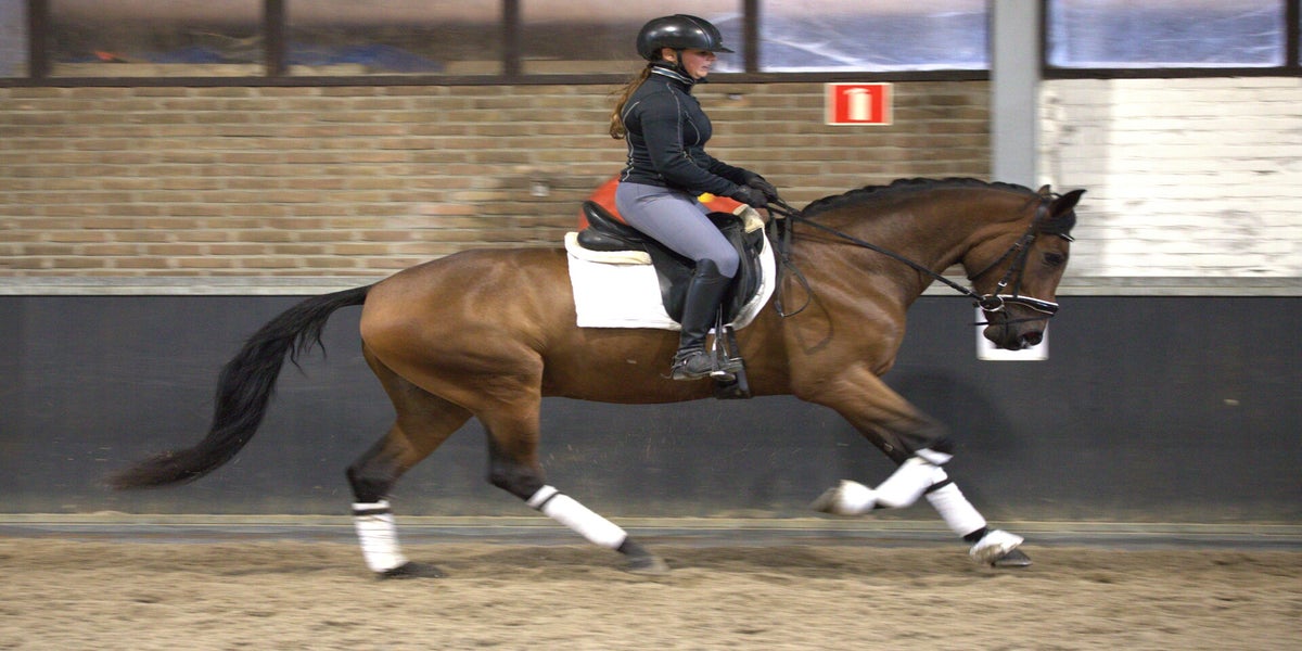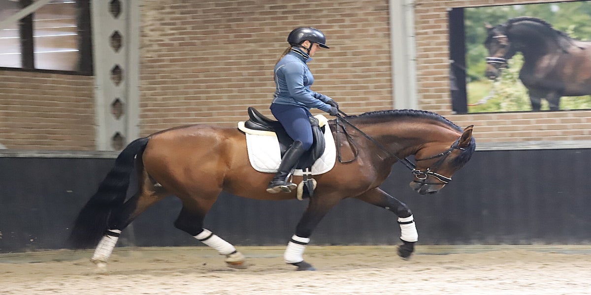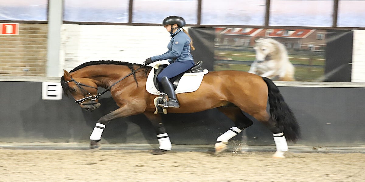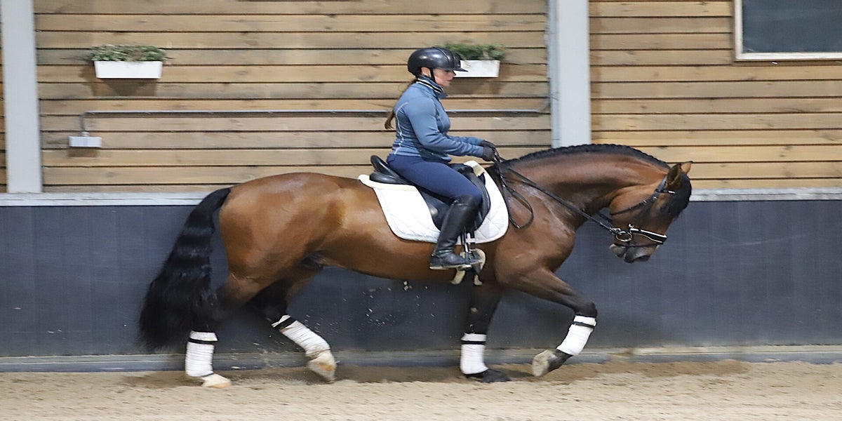 Onder het zadel laat hij al veel talent zien: een ruime, krachtige stap met veel losheid door het hele lijf. De basis beheerst hij en hij wordt rustig verder doorgetraind om aan conditie en bespiering te werken.