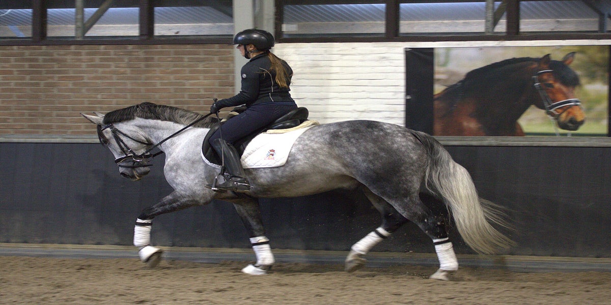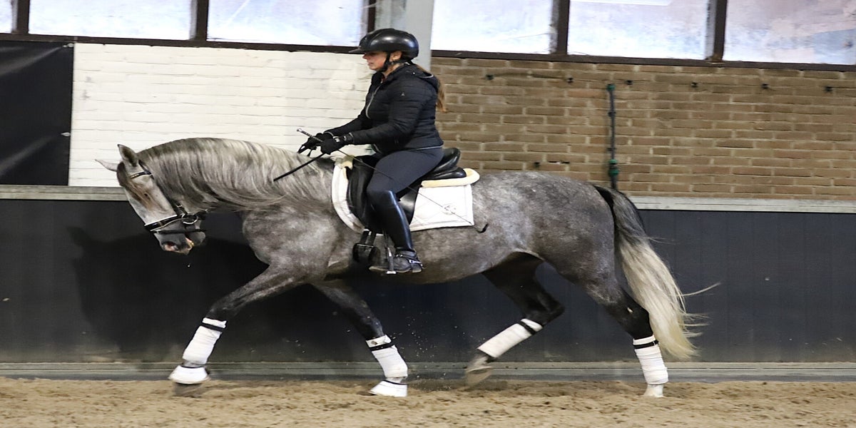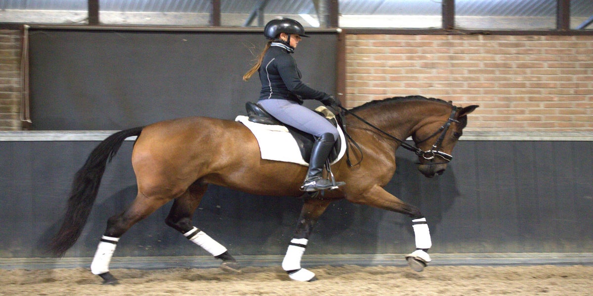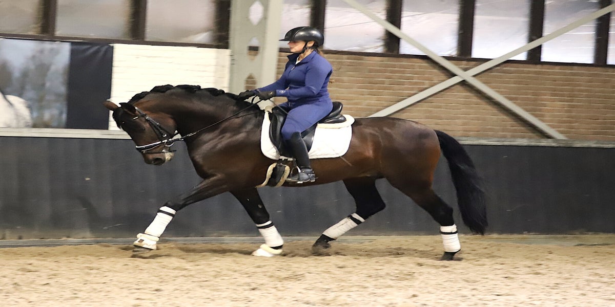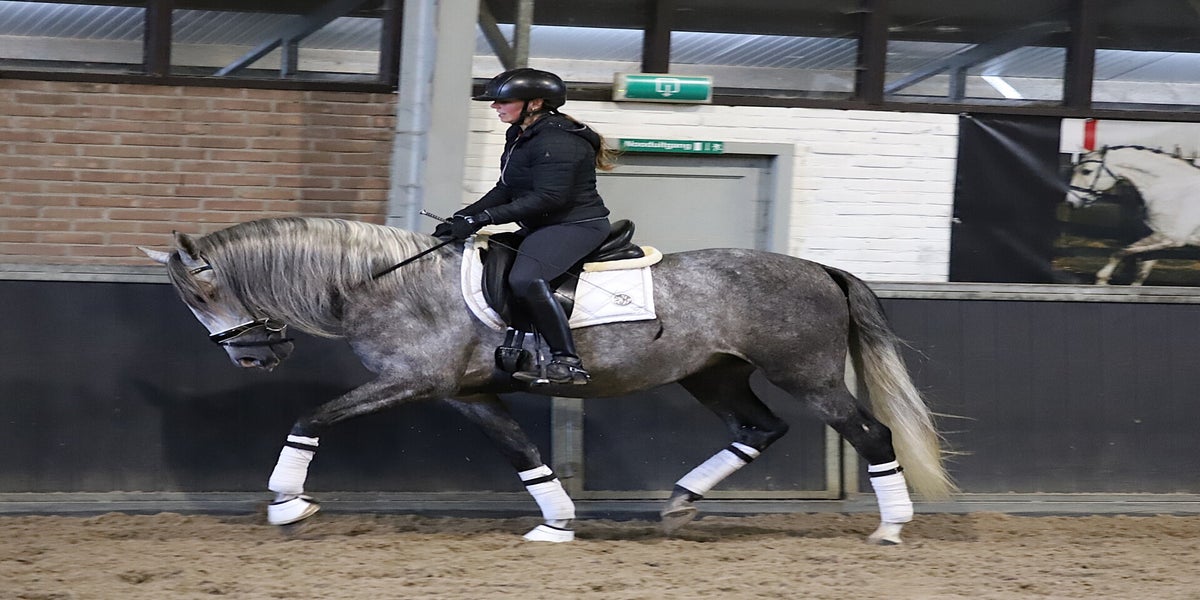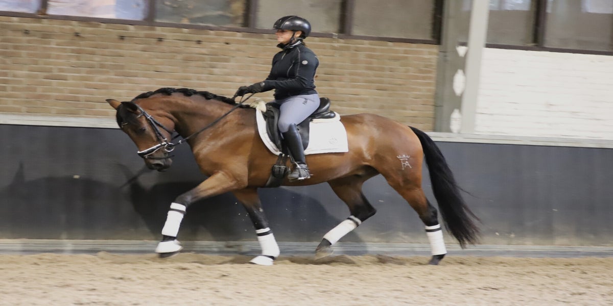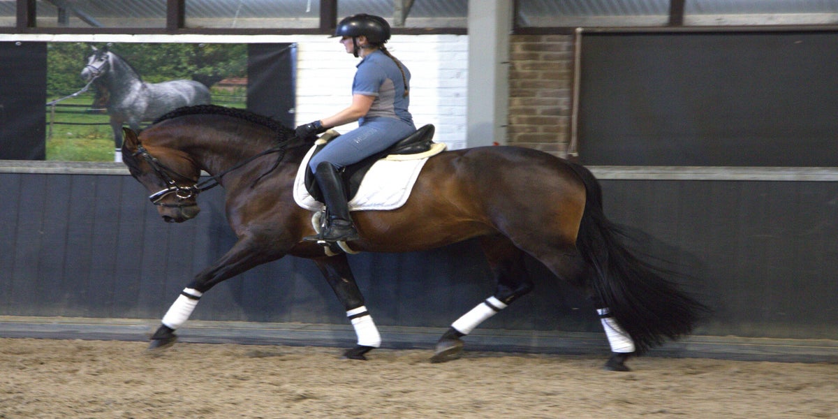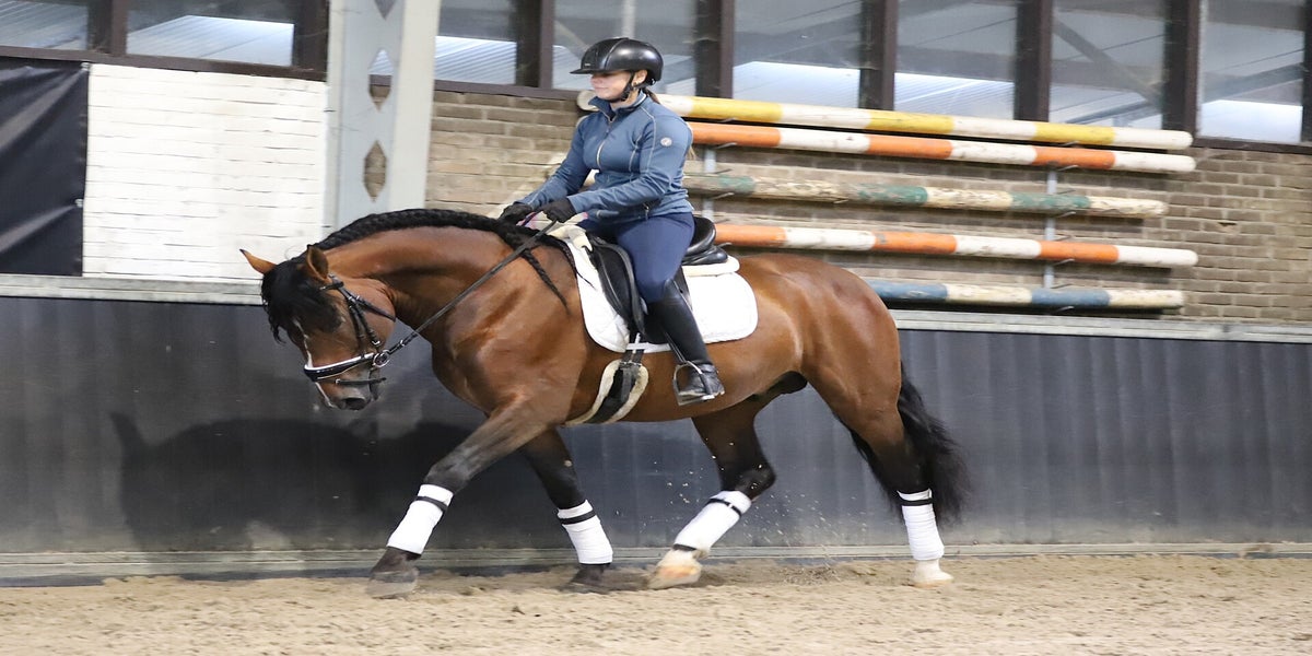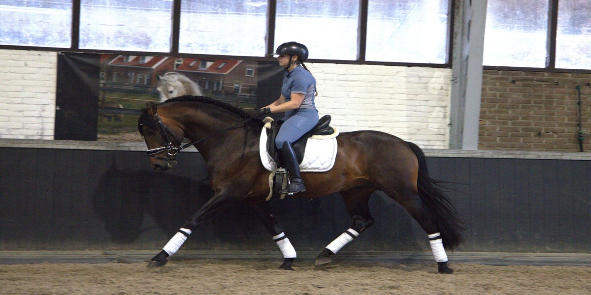 Onder het zadel laat hij al veel talent zien: een ruime, krachtige stap met veel losheid door het hele lijf. De basis beheerst hij en hij wordt rustig verder doorgetraind om aan conditie en bespiering te werken.