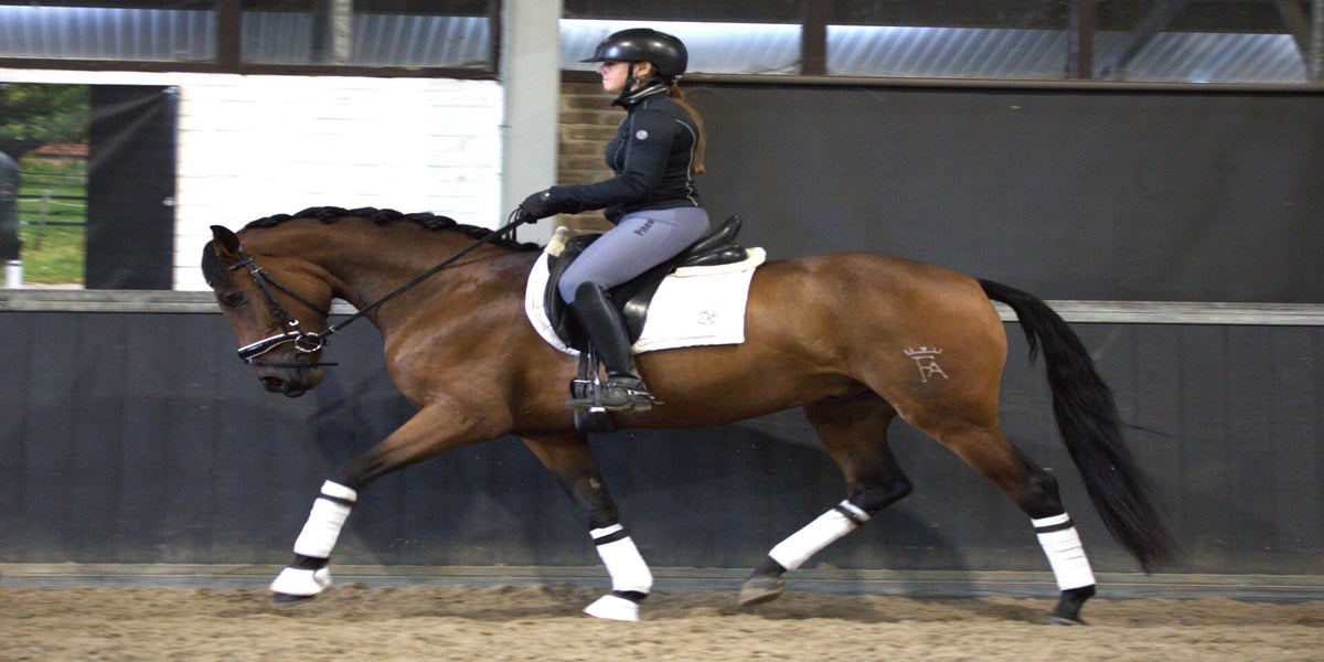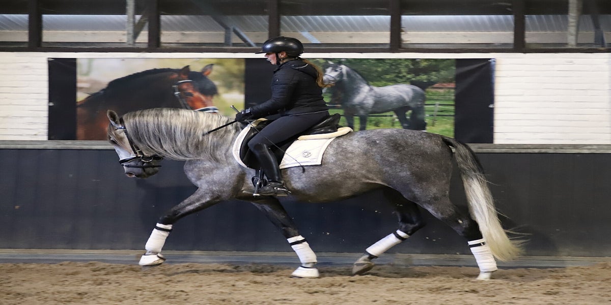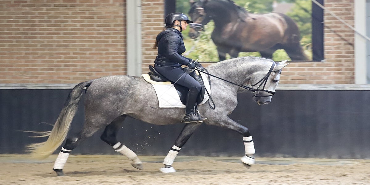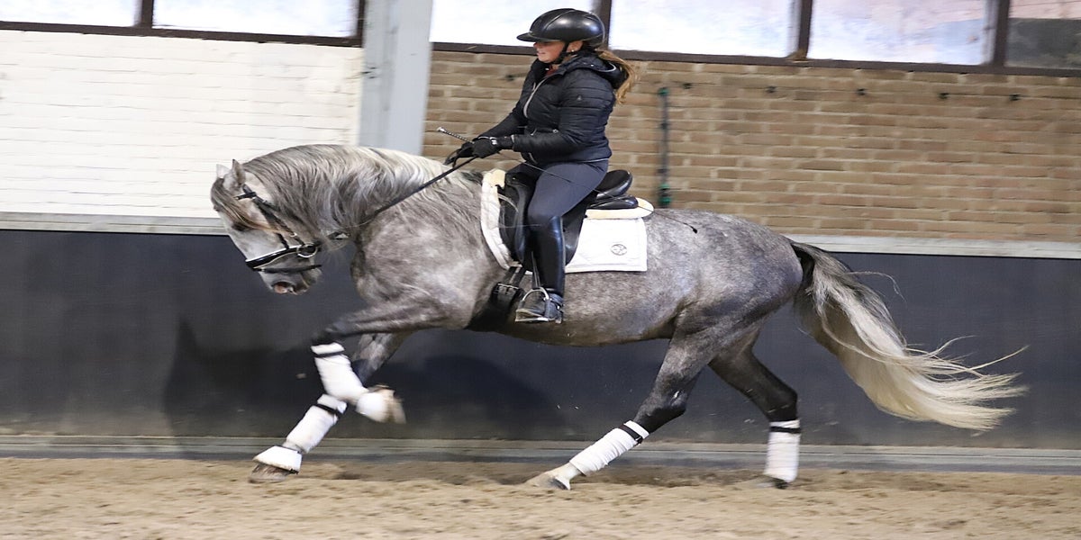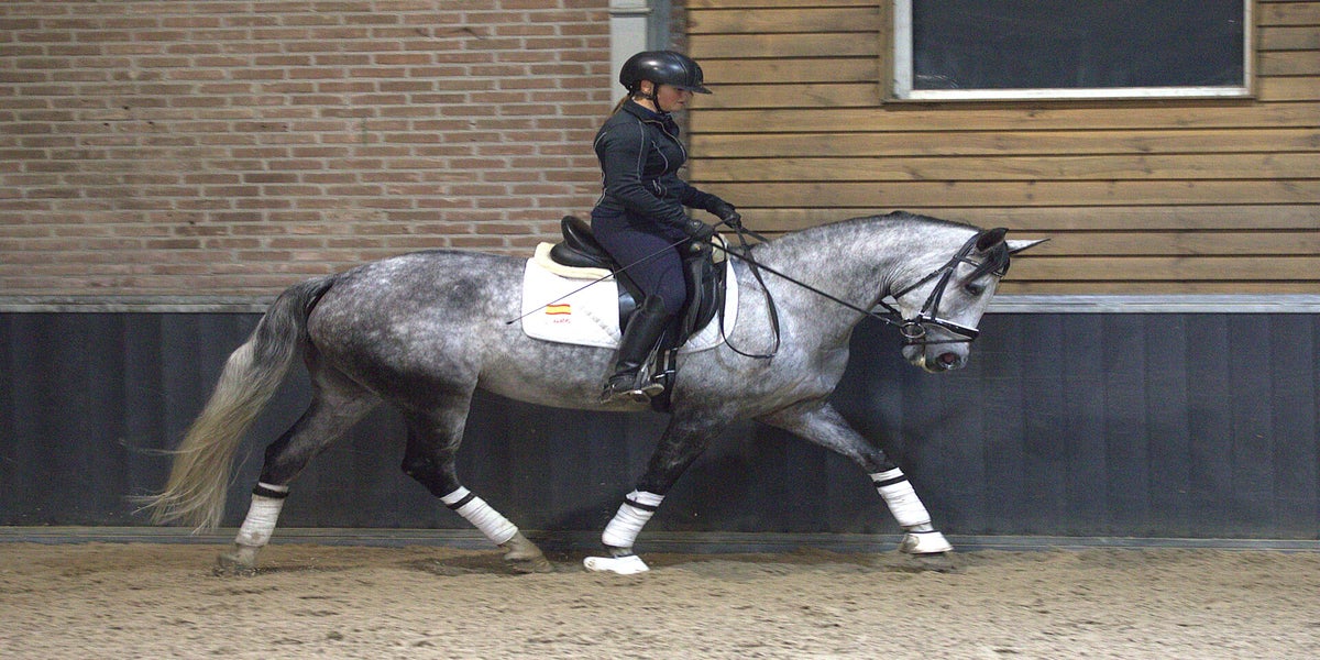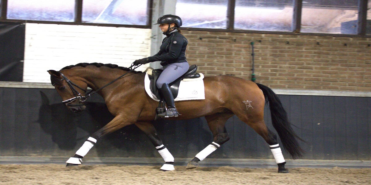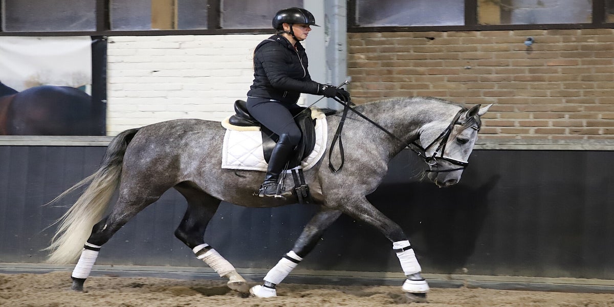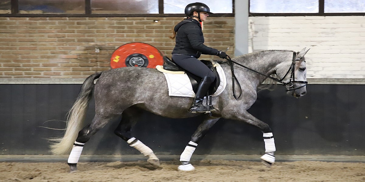 Onder het zadel laat hij al veel talent zien: een ruime, krachtige stap met veel losheid door het hele lijf. De basis beheerst hij en hij wordt rustig verder doorgetraind om aan conditie en bespiering te werken.