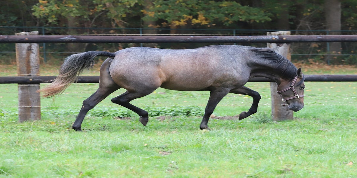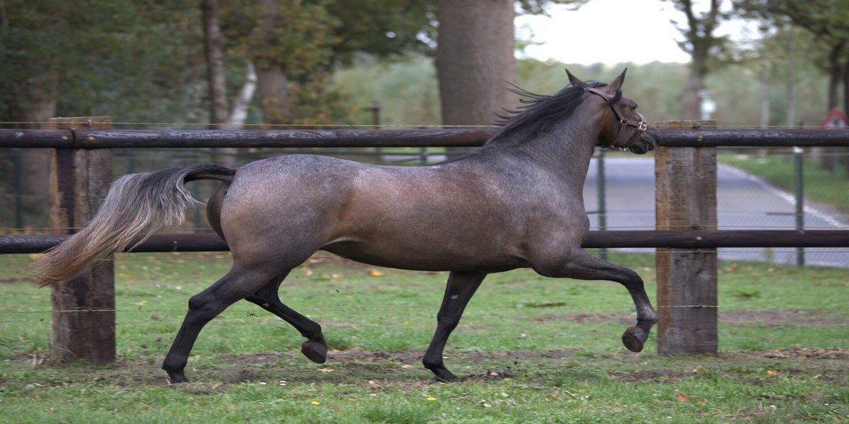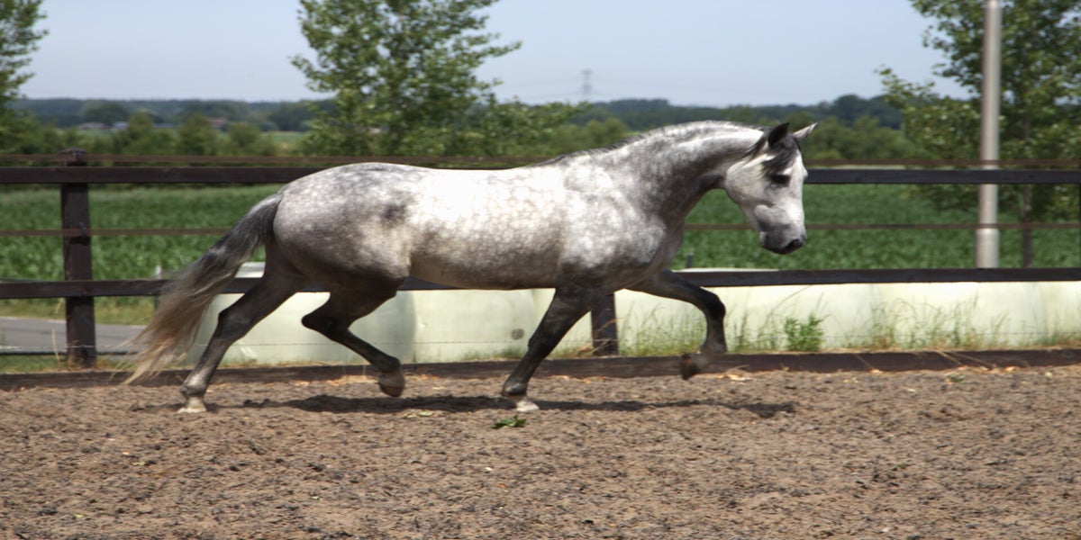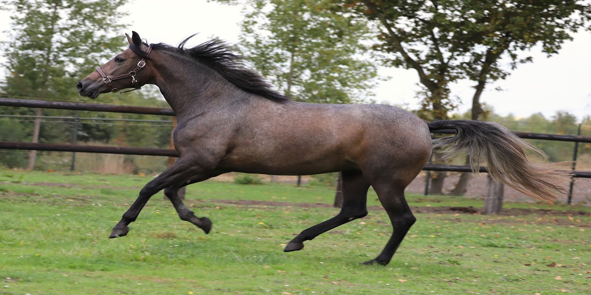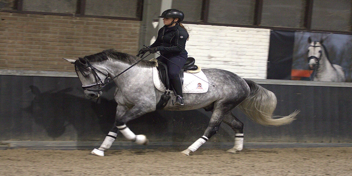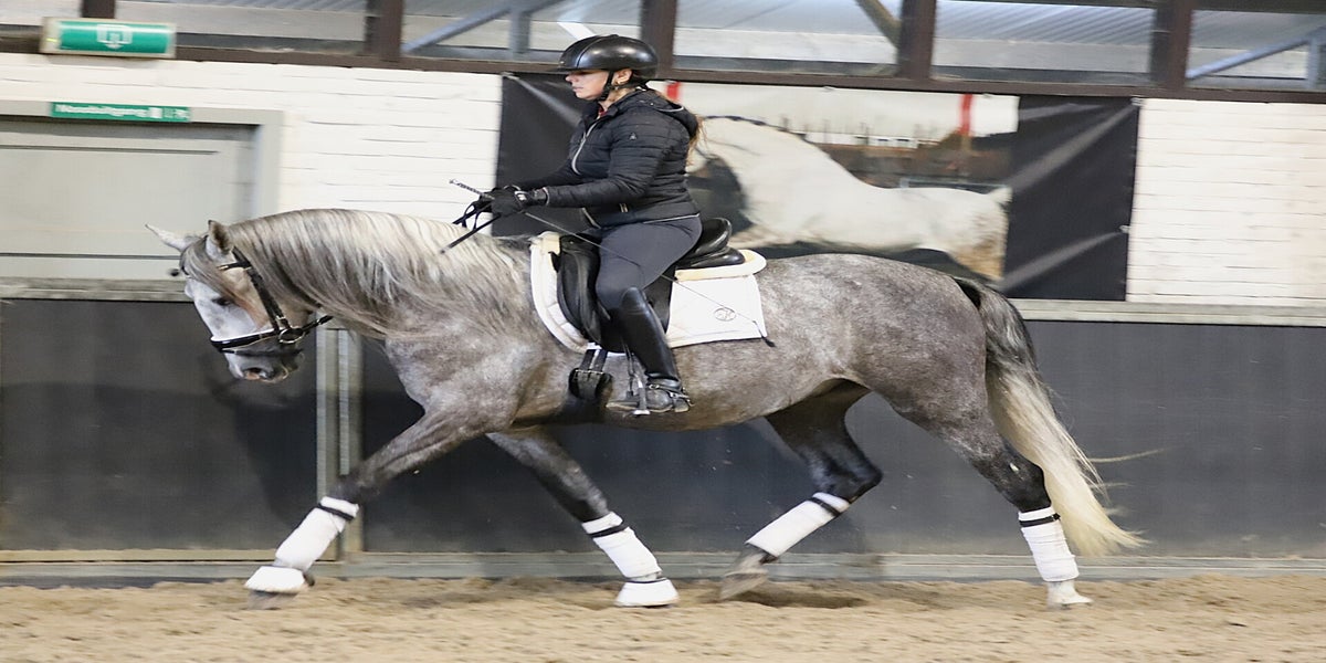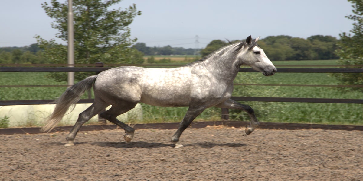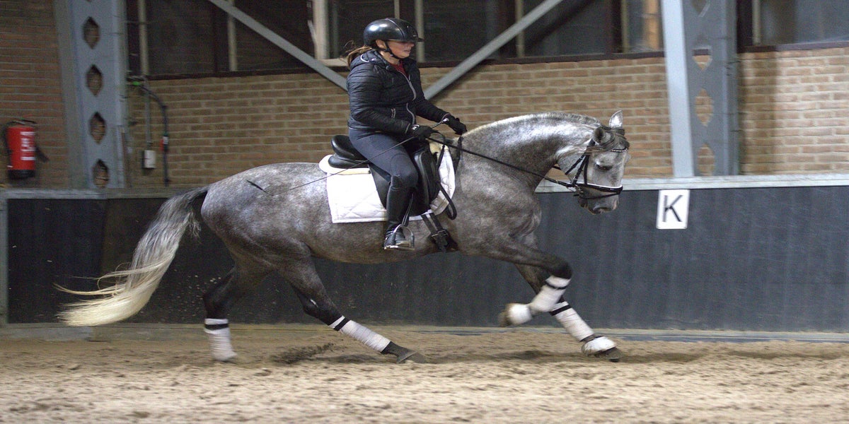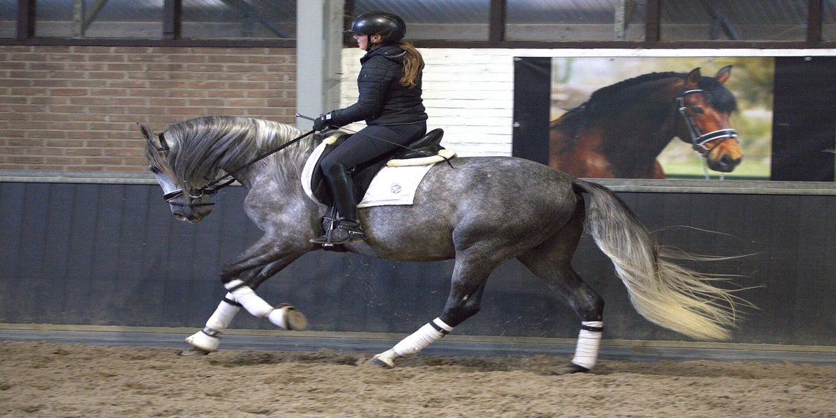 Onder het zadel laat hij al veel talent zien: een ruime, krachtige stap met veel losheid door het hele lijf. De basis beheerst hij en hij wordt rustig verder doorgetraind om aan conditie en bespiering te werken.