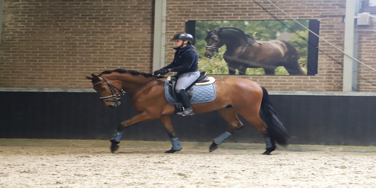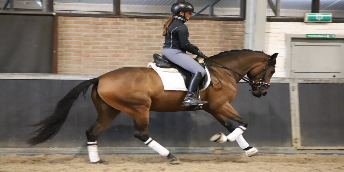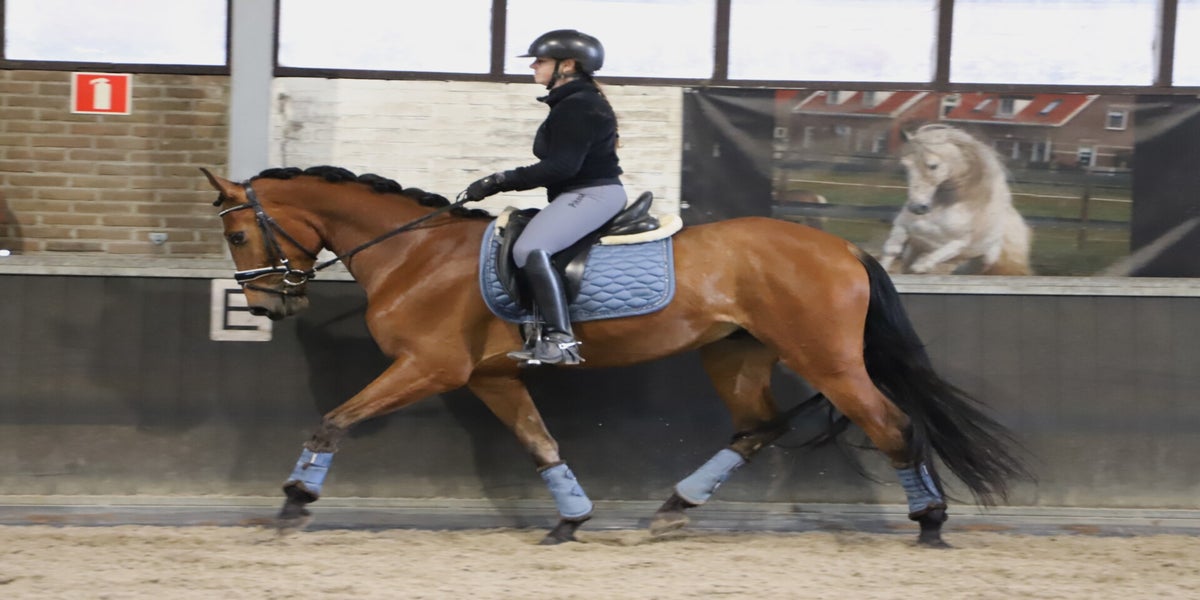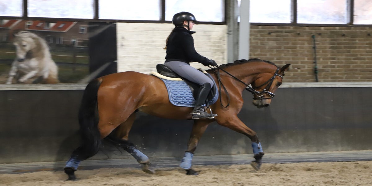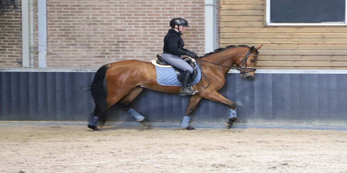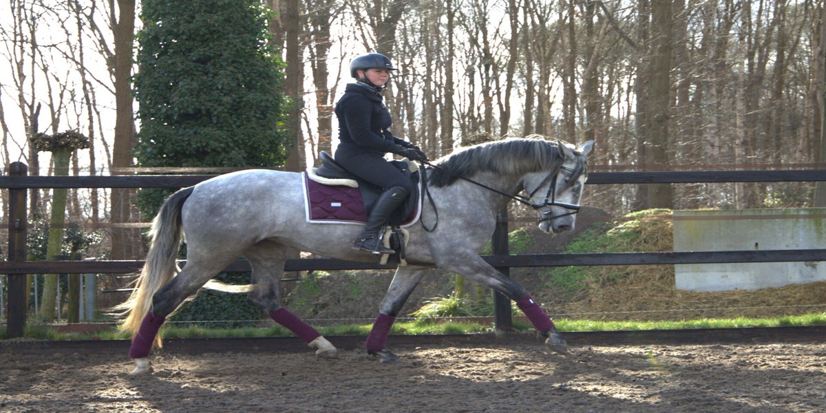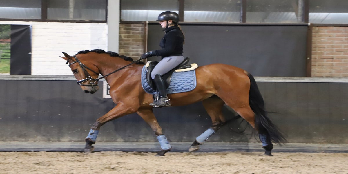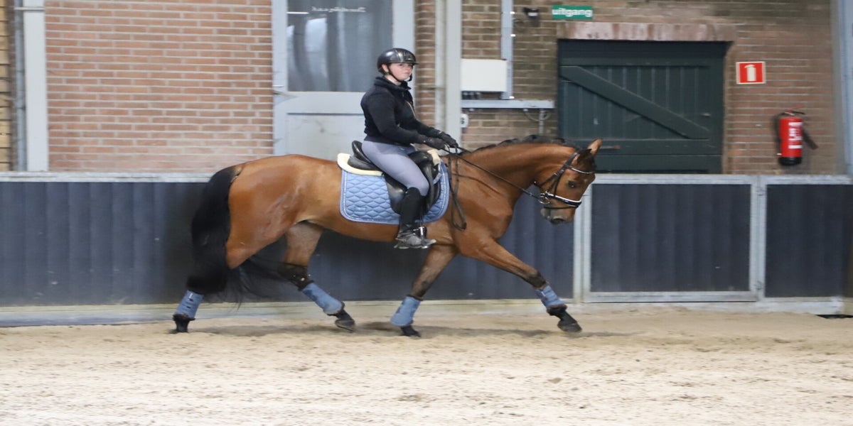Deze super gave merrie is een aantal maanden onder het zadel, en doet dit super goed. Ze beheerst nu netjes de basis waarvan al een heel fijn verzameld galopje. Ze is niet kijkerig of sensibel