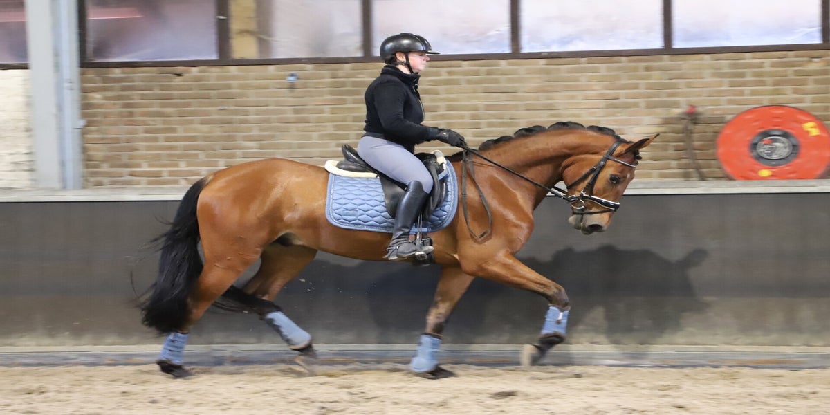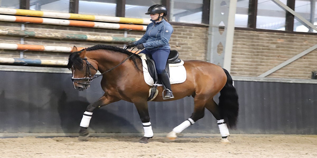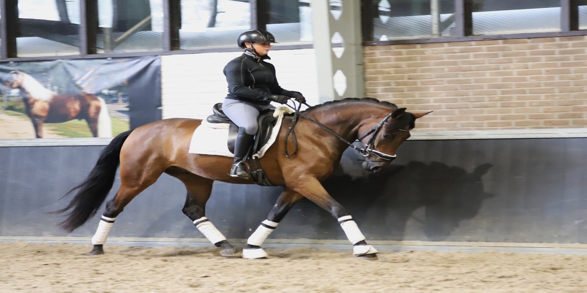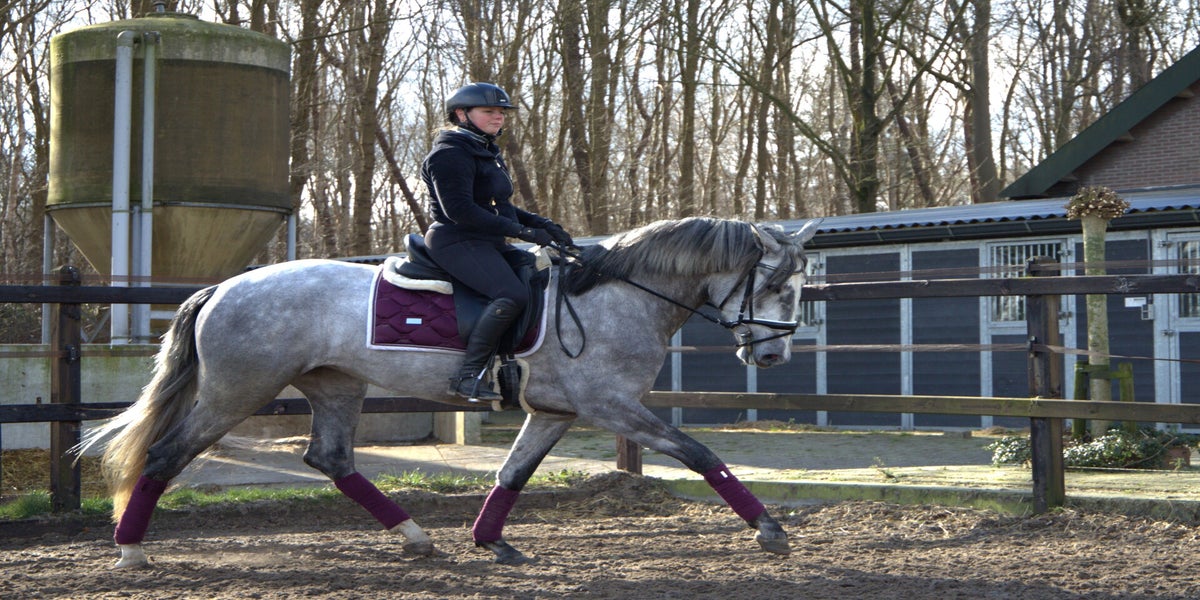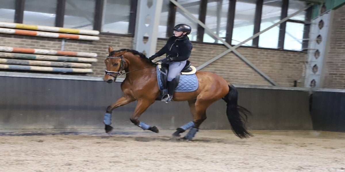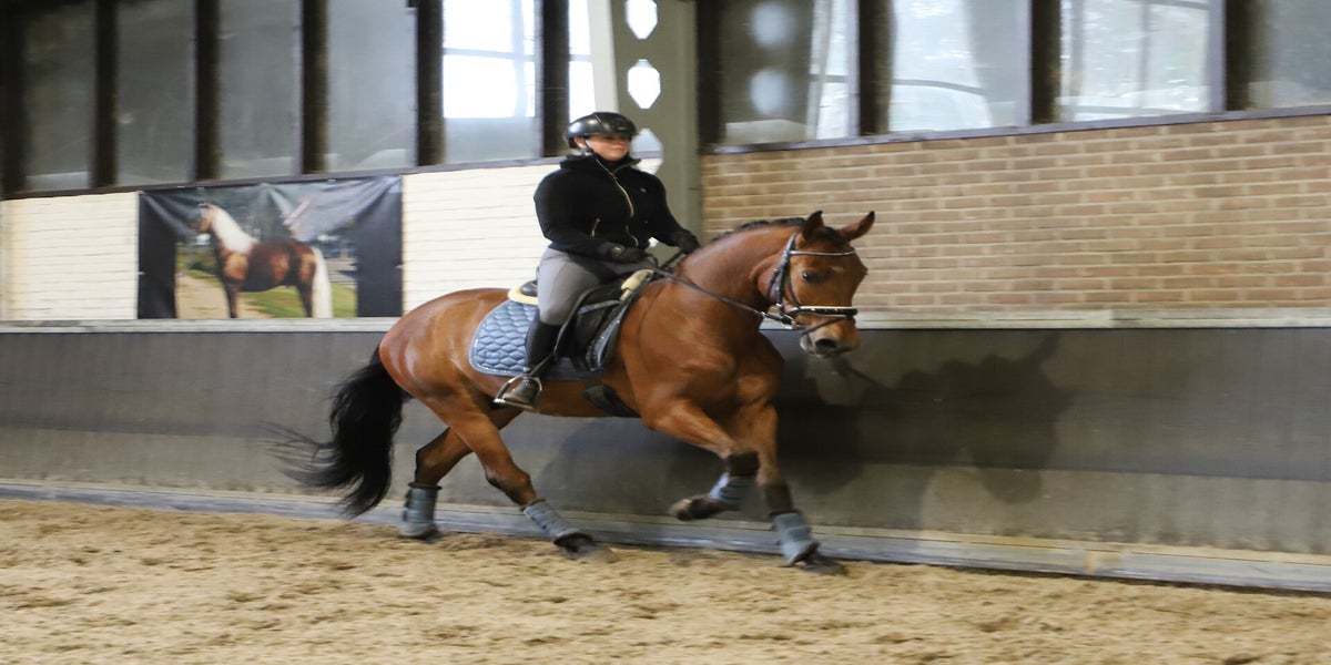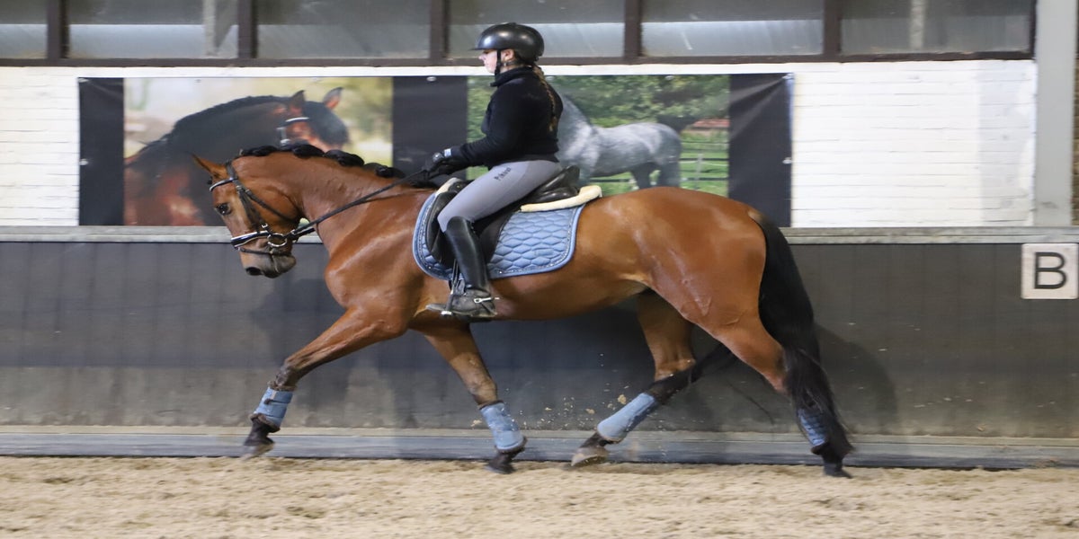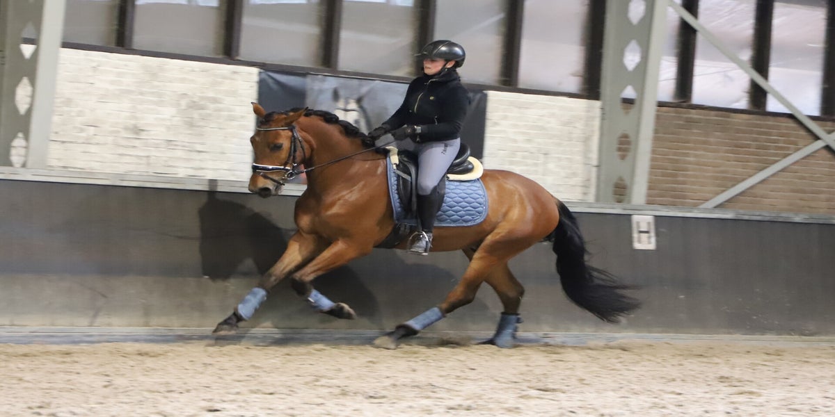 Deze super gave merrie is een aantal maanden onder het zadel, en doet dit super goed. Ze beheerst nu netjes de basis waarvan al een heel fijn verzameld galopje. Ze is niet kijkerig of sensibel