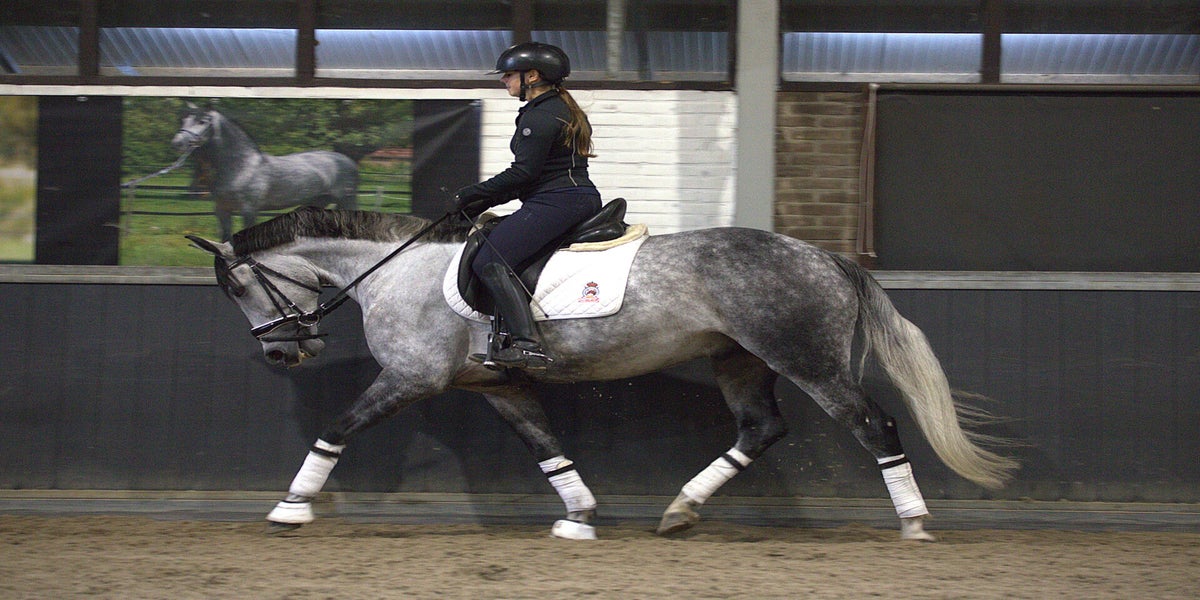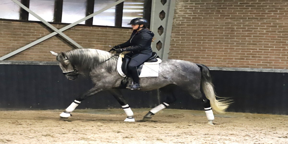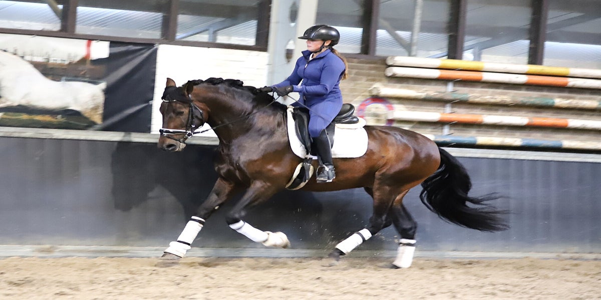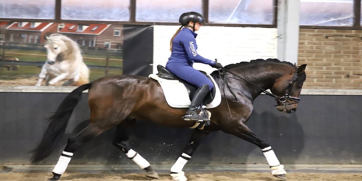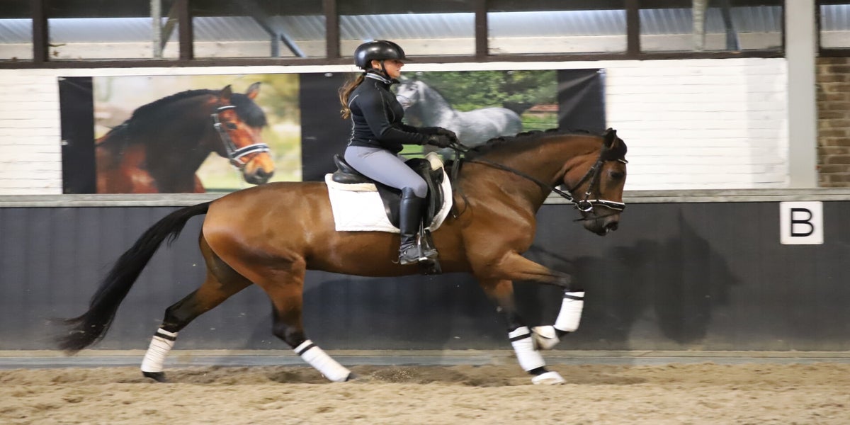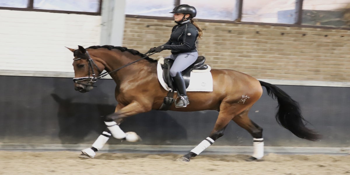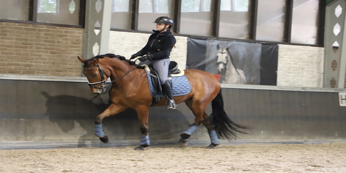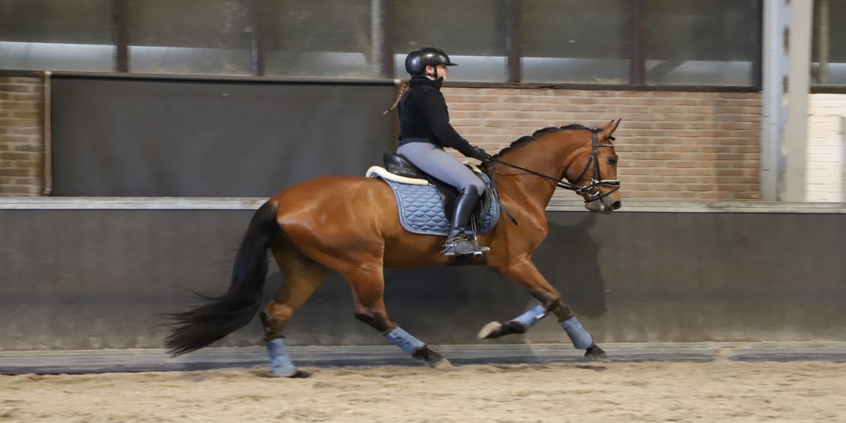 Deze super gave merrie is een aantal maanden onder het zadel, en doet dit super goed. Ze beheerst nu netjes de basis waarvan al een heel fijn verzameld galopje. Ze is niet kijkerig of sensibel
